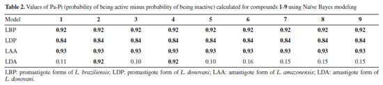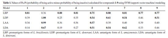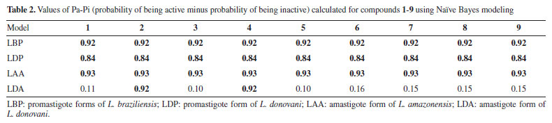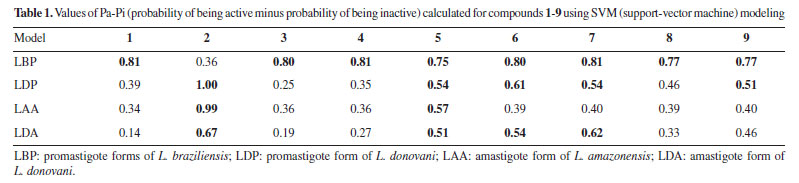 In summary, nine compounds were analyzed, four of the friedelin framework and five other TTPs. A total of 10 datasets were modeled, three for amastigote forms of L. amazonensis, L. donovani, and L. infantum. The other five datasets were associated with promastigote forms of L. brasiliensis, L. donovani, L. infantum, L. major, and L. mexicana. The last two datasets were associated with the enzymes pteridine reductase 1 of L. major and pyruvate kinase of L. mexicana. Tables 1 and 2 present the potential antileishmanial activity estimates from Pa-Pi (probability of being active minus probability of being inactive) values of the simulations for compounds 1-9 using support-vector machine (SVM) and Naïve Bayes modeling. According to Sudan et al.,17 more promising activities appear when Pa-Pi values exceed 0.5 and 0.8 for SVM and Naïve Bayes models, respectively. The values that exceed these limits are placed in bold type.