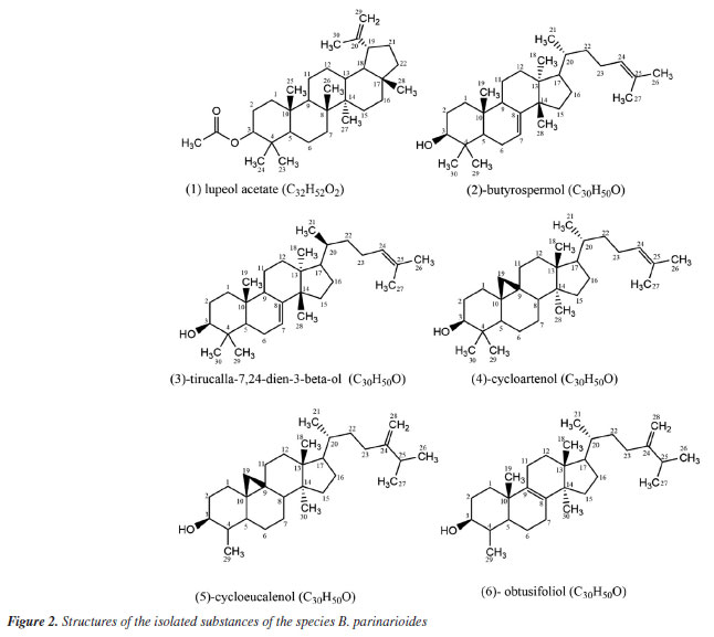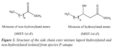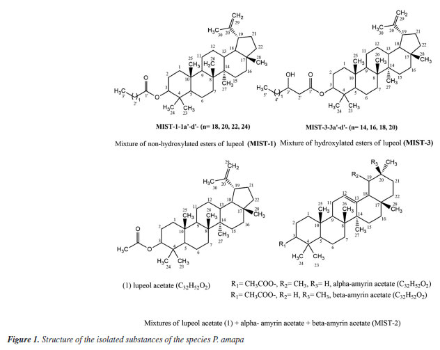 RESULTS AND DISCUSSION The phytochemical study of dichloromethane extract from latex of P. amapa yielded the isolation of a mixture of non-hydroxylated lupeol esters (MIST-1-1a'-d') (315.4 mg), a mixture of the acetyl triterpenes α-amyrin acetate, β-amyrin acetate and lupeol acetate (MIST-2) (118.2 mg), the lupeol acetate (1) (13.0 mg) and a mixture of hydroxylated esters of lupeol (MIST-3-3a'-d') (Figure 1). From B. parinarioides, the compounds 1 (12.3 mg), 2 (6.5 mg), 3 (12.5 mg), 4 (3.5 mg), 5 (31.1 mg) and 6 (26.0 mg) were isolated and identified by 1D, 2D NMR and analysis by LC-MS and DI-MS (direct infusion) (Figure 2).