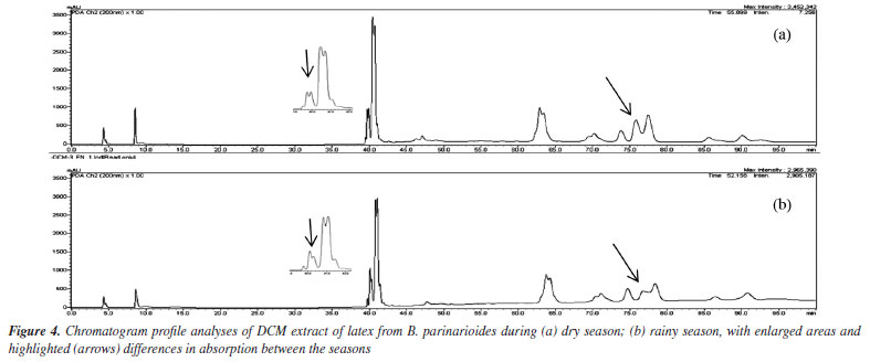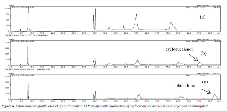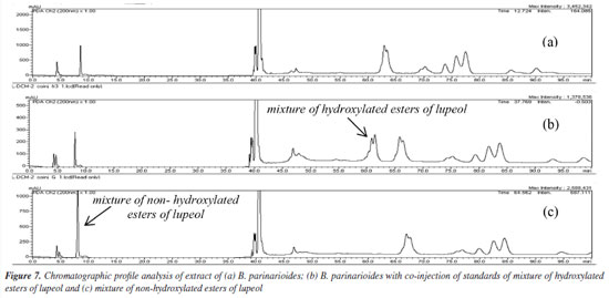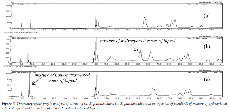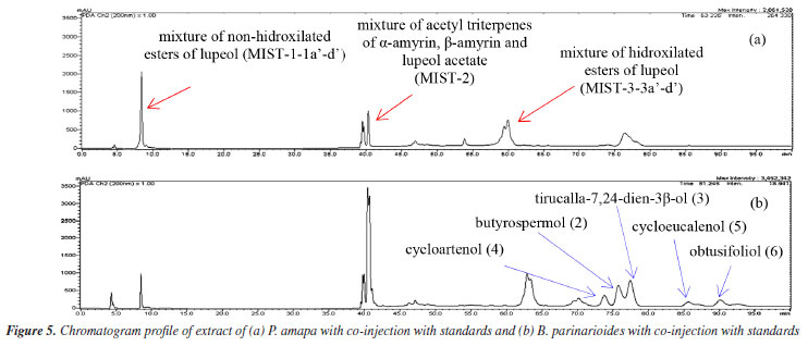 The HPLC profile analysis of BPL-D with co-injection of isolated standards of P. amapa (MIST-1, MIST-2 and MIST-3) and lupeol acetate (1) indicated solely the presence of the mixture of acetyl triterpenes (MIST-2) and lupeol acetate (1). Clearly the presence of mixture of hydroxylated esters of lupeol (MIST-3) could not be detected, while the presence of mixture of non-hydroxylated esters of lupeol (MIST-1) was inconclusive (Figure 7). The standard MIST-3 is clearly chemotypes from the latex of P. amapa and not from B. parinarioides. Besides, some minor triperpenes, namely cycloeucalenol (5), and obtusifoliol (6), could only be isolated and detected from the dichloromethane extract from the latex of B. parinarioides and not from P. amapa. All other compounds could be either isolated or detected in both species.