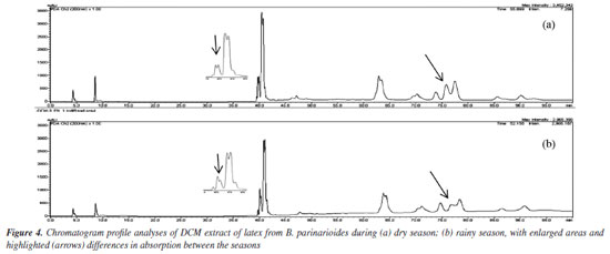 The 1H NMR data of the mixture of acetyl triterpenes (MIST-2) were compared with literature12,13 and confirmed by GC-MS (Figure 52S and Table 1S, Supplementary Material). The three compounds in the mixture showed MS spectra with the same fragmentation profile (m/z 189, 203, 218) to β- and α-amyrin acetate and m/z 189 to lupeol acetate (Figures 53S-55S, Supplementary Material). The ion m/z 218 is a key fragment observed in ursane and oleanane skeletons, which resulted from a Retro-Diels-Alder rearrangement on ring C.29,30 The analysis of the mass spectra obtained for MIST-2, and the comparison with data from the spectral libraries available in the equipment such as NIST, Wiley and the library created by the Research Laboratory (NPPS, Research Center for Natural Products and Synthesis), showed that it was the expected mixture of triterpenes, with similarity index (SI) 95% for β-amyrin acetate, SI 96% for α-amyrin acetate and SI 88% for lupeol acetate. The compound 1 isolated from P. amapa had its acetyl unit determined by 1H and 13C NMR, identified as lupeol acetate (Figures 7S and 8S, Supplementary Material).9 The MS spectra presented the ion m/z 409, resulting from the loss of the acetyl group (Figure 9S, Supplementary Material). The 1H and 13C NMR spectra and MS spectrum of compound 1, isolated from B. parinarioides, presented signals similar to those published for lupeol acetate (Figures 10S-12S, Supplementary Material).12,18-20 The 1H NMR, 13C NMR, DEPT 135, HSQC, and HMBC data of 2 (Figures 13S-17S, Supplementary Material), have helped to identify this compound as being the triterpene butyrospermol.24,25 But based on the HMBC observed correlations of hydrogen at δH 0.805 (3H, s, H-18) to the carbon signals δC 34.179 (C-12), 43.891(C-13) and 51.633 (C-14); along with the hydrogen at δH 0.744 (3H, s, H-19) that presented correlations to the carbon signals at δC 37.559 (C-1), 50.992 (C-5) and 35.296 (C-10), the methyl groups C-18 and C-19 were reassigned. The MS obtained by LC-MS at positive mode and APCI ionization showed the m/z 427.3913 (calculated m/z 427.3939) and the base peak with m/z on 409.3845 [M + H - H2O]+ (calculated m/z 409.3834) (Figure 23S-24S, Supplementary Material). The chemical shifts from 1H and 13C NMR, and correlations on HSQC and HMBC observed from compounds 2-6, confirmed the identification of tirucalla-7,24-dien-β-ol (3) (Figures 18S-22S, Supplementary Material), an epimer of butyrospermol (2) (Figures 13S-17S, Supplementary Material), cycloartenol (4) (Figures 26S-29S, Supplementary Material), cycloeucalenol (5) (Figures 31S-35S, Supplementary Material) and obtusifoliol (6) (Figures 37S-40S, Supplementary Material) when compared to literature.23,26,27 Reassignments of 13C NMR chemical shifts for obtusifoliol (6) were conducted based on literature comparisons for C-8 and C-9, based on the HSQC and HMBC experiments performed, as previously mentioned for butyrospermol. Determination of the side chain of methyl esters by GC-MS After an acid transesterification of the mixture of lupeol esters, the determination of the side chains from these compounds was performed by GC-MS and is presented in Table 1. The acid methanolysis of MIST-1 yielded lupeol and a mixture of four methyl of non-hydroxylated esters (MIST-1-1a'-d') (Figures 42S-46S, Supplementary Material). MIST-1 presents side chains containing 18 to 24 carbons as observed on MS spectra and described as follows. EIMS: m/z (rel. int): MIST-1a' 326 (M.+, 17), 283 (17), 241 (9), 199 (15), 143 (33), 129 (17), 87 (99), 75 (32), 74 (100); MIST-1b' 354 (M+, 18), 311 (16), 213 (6), 199 (21), 143 (40), 87 (78), 75 (32), 74 (100); MIST-1c' 382 (M.+, 26), 339 (15), 283 (9), 241 (2), 199 (21), 143 (44), 87 (80), 75 (41), 74 (100); MIST-1d' 410 (M+, 16), 367 (10), 311 (5), 199 (13), 143 (51), 87 (69), 75 (37), 74 (100). The data obtained in this work for MIST-1 showed variation in comparison to the data obtained by Sobrinho et al.8 The four methyl esters presented a base peak of m/z 74, which has high intensity due to McLafferty rearrangement. On the other hand, the identification of MIST-3-3a'-d' was performed by the characteristic ion m/z 103, which shows the presence of hydroxyl esters on the side chain, as confirmed by NMR spectra. To some MS spectra of these esters that present hydroxyl group on C-3' and that did not present molecular ion, the ion [M - H2O]+ has been used to identify these characteristics once this ion corresponds to the loss of an H2O molecule. The esters of MIST-3 presented five peaks on chromatogram, where four are from the side chain of lupeol esters hydroxylated and one to lupeol. MIST-3 is a mixture of lupeol esters with the side chains of 14 to 20 carbons (MIST-3-3a'-d'). The data obtained in this work for MIST-3 showed variation in comparison to the data obtained by Sobrinho et al.8 EIMS: m/z (rel. int): MIST-3a' 296 (0.7, M-H2O), 103 (100); MIST-3b' 324 (0.7, M-H2O), 103 (100); MIST-3c' 352 (1.0, M-H2O), 103 (100); MIST-3d' 380 (1.0, M-H2O), 103 (100) (Figures 47S-51S, Supplementary Material). The retention time and relative percent (based on the area of each peak) of each identified methyl esters on the mixture are presented on the Table 1. HPLC profile analysis of latex from P. amapa and B. parinarioides The HPLC profile of dichloromethane extracts from B. parinarioides, obtained during both the dry and rainy seasons, shows a similar composition (Figure 4). However, the intensity of some peaks varies between the two extracts. Based on these findings, the dichloromethane extract of B. parinarioides from the dry season was selected for comparison with the dichloromethane extract of P. amapa.