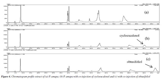 The chromatographic profiles for PAL-D (dichloromethane extract of P. amapa) and BPL-D (dichloromethane extract of B. parinarioides) by normal phase HPLC showed similar and different compounds when compared with the standards analysis under the same conditions. The profile of extracts, followed by co-injection of authentic standards isolated of both species (Figure 5), identified the presence or absence of these compounds in extracts by the increased intensity of the peaks and time retention.