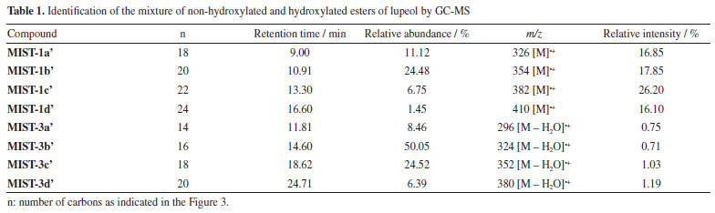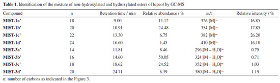 The NMR spectra of MIST-1 and MIST-3 (Figure 3) confirmed these mixtures as 3-O-acil-lupeol esters and compared with the literature.8,9 These mixtures of esters of acyl-lupeol were analyzed by GC-MS,8 after acid transesterification to determine the side chain of these compounds (Table 1) (Figures 42S-51S, Supplementary Material).