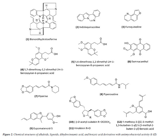 RESULTS Research into natural products in Brazil as a strategy for treating tuberculosis Natural products have gradually had a significant impact on human health, and various classes of natural products have been isolated and characterized. The production of secondary metabolites with distinct biological activities has further established natural products as a source of health products and structural models for discovering new therapeutic compounds actions.40 Natural compounds and extracts from plants, marine organisms, microorganisms, animals, and other natural sources have demonstrated inhibitory activity against M. tuberculosis.6,32,33 This supports the potential of natural products to inhibit mycobacterial growth, as data indicate promising activity from various sources, species, and compounds in experimental studies and research involving traditional knowledge of using natural products for tuberculosis treatment. This establishes a foundation for future experimental research to enhance treatment for tuberculosis patients. Several reviews regarding natural products and tuberculosis published in reputable journals were examined to establish criteria for defining promising antimycobacterial natural products. Among them, only three detailed the requirements adopted. García et al.41 considered compounds with minimum inhibitory concentration (MIC) values ≤ 60 μg mL-1 to be promising, while Copp and Pearce6 used a ≤ 64 μg mL-1 threshold. Okunade et al.32 set a higher limit of ≤ 200 μg mL-1. Defining a universal parameter is challenging for extracts, but some authors suggested a promising MIC of ≤ 100 μg mL-1.37,42,43 To be more inclusive in this study, we will consider samples with MIC values ≤ 200 μg mL-1 as exhibiting antimycobacterial activity. Table 1 summarizes the data for isolated compounds, while Table 2 presents the data for extracts, fractions, and essential oils. Studies based on isolated compounds and extracts from plant species The use of plant species is one of the oldest forms of treatment for health problems. Approximately 60% of the population of the world still depends on medicinal plants for primary health care.44 Although Brazilian biodiversity contributes significantly to the search for new bioactive compounds, few species have been thoroughly investigated for their medicinal properties. This fact highlights the need for research in this area, which will enable the sustainable use of plant species as a resource for treating various diseases. For decades, Brazilian researchers have evaluated the antimycobacterial activity of plant species and the compounds isolated from them. This review presents these studies, organizing them according to the chemical class and natural source. Compounds Alkaloids Initially, Melo et al.45 evaluated the activity of the alkaloid bisnordihydrotoxiferine (1) (Figure 2) extracted from the roots of Strychnos trinervis (Loganiaceae) against various bacteria, including three species of Mycobacterium, among which M. tuberculosis was inhibited in its growth by the present alkaloid, with a MIC of 30-40 µg mL-1.