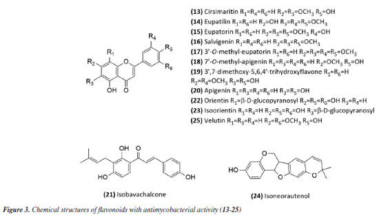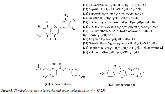 Then, continuing in the alkaloids class, Severino et al.46 investigated the antimycobacterial activity of several natural products extracted from Hortia species. The alkaloids indolequinazoline (2) and furoquinoline (3) (Figure 2) were isolated from leaves and stems of H. oreadica, H. superba, and H. brasiliana (Rutaceae). Compounds 2 and 3 had a MIC of 15.62 and 31.25 µg mL-1, respectively. Isolated from these species, dihydrocinnamic acid derivatives (4 and 5) (Figure 2) had a MIC of 62.50 µg mL-1 against the H37Rv strain of M. tuberculosis. These compounds were kept together with the alkaloids, considering the same plant source and the higher activity observed for the alkaloids. The dichloromethane extract of Hortia oreadica also showed significant activity against M. tuberculosis H37Rv with a MIC of 31.25 μg mL-1.46 The results suggest that the structure of the alkaloids may be crucial for their antimycobacterial activity, especially the indole and quinoline skeletons. These constituents have great potential for developing new antimycobacterial agents, offering a less toxic alternative to synthetic drugs. Pollo et al.47 evaluated 52 compounds against the reference strain H37Rv, and damnacanthal (6), an alkaloid isolated from Psychotria schimperi, was the most active compound in the screening, with a MIC of 13.07 µg mL-1. Piperine (7) (Figure 2), an alkaloid found in Piper nigrum and Piper longum (Piperaceae), was evaluated for its antimycobacterial activity against M. tuberculosis strains, yielding MIC values ranging from 31.2 to 125 μg mL-1. These values were reduced when the piperine alkaloid was combined with rifampicin and streptomycin, and the MIC values of the combinations also suggested a synergistic effect against the susceptible strain H37Rv and clinical isolates evaluated.48 Following studies on the genus Piper and alkaloids, the crude extract of the roots of Piper corcovadensis (Piperaceae), its alkaloid fraction, and an isolated isobutylamide, piperovatine (8) (Figure 2), showed MIC values of 15.6, 7.8, and 7.8 μg mL-1, respectively, against the M. tuberculosis H37Rv strain. These samples were also evaluated against clinical isolates, with MIC values of 0.98 to 3.9 μg mL-1 for the extract, MIC of 0.48 to 3.9 μg mL-1 for the fraction, and MIC of 0.48 to 1.95 μg mL-1 for piperovatine. The samples did not show cytotoxic effects when evaluated in the active concentrations and indicated a synergistic effect when assessed in combination with rifampicin.49 A summary of the MIC values presented in this sub-section is provided in Table 1. Lignoids Alkaloids were not the only class reported for Piper species as promising antimycobacterial compounds. Scodro et al.50 isolated three neolignans from Piper regnellii (Piperaceae) and obtained five derived compounds. Among the neolignans evaluated against M. tuberculosis, the isolated compound eupomatenoid-5 (9) (Figure 2) was the most active, presenting a MIC of 1.9 µg mL-1 against the H37Rv strain and the 73A strain (resistant to isoniazid, rifampicin, and pyrazinamide). Additionally, it exhibited a selectivity index (SI) of 20 and was suggested by the group as a potential candidate for future anti-tuberculosis drugs. The lignan cubebin was isolated from seeds of Piper cubeba L. (Piperaceae), and its derivatives were analyzed against different Mycobacterium species, including M. tuberculosis, M. kansasii, and M. avium. The two compounds (-)-O-acetyl-cubebin (10) and hinokinin (11) (Figure 2) showed activity with a MIC of 62.5 and 125 μg mL-1, respectively, against the M. tuberculosis strain H37Rv.51 The results suggest the potential of these lignans as candidates for the development of new antimycobacterial agents, particularly in the context of increasing drug resistance in tuberculosis treatment.51 Table 1 provides a summary of the MIC values presented in this sub-section. Benzoic acid derivatives Leaf extracts of another Piper species, Piper diospyrifolium, obtained by supercritical fluid extraction, and a novel benzoic acid derivative: 4-methoxy-3-[(E)-3-methyl-1,3-butadien-1-yl]-5-(3-methyl-2-buten-1-yl)-benzoic acid (12) (Figure 2) were evaluated against the M. tuberculosis H37Rv strain and eight other clinical isolates of M. tuberculosis. The benzoic acid derivative showed a MIC of 125 μg mL-1 for the H37Rv strain (Table 1), as well as its extracts (Table 2); for the clinical isolates, the activity was ≥ 250 μg mL-1, suggesting low activity for these strains.52 It can be inferred that the evaluated Piper species contain active compounds and are promising candidates for the development of anti-TB drugs. However, further studies are needed to confirm their in vivo efficacy and possible mechanisms of action. Flavonoids For the flavonoid class, in 2011,53 seven methoxyflavones named cirsimaritin (13), eupatilin (14), eupatorin (15), salvigenin (16), 3'-O-methyl-eupatorin (17), 7'-O-methyl-apigenin (18), and 3',7-dimethoxy-5,6,4'-trihydroxyflavone (19) were isolated from the dichloromethane extract of Lippia lacunosa (Verbenaceae). All compounds were evaluated for their antimycobacterial activity in M. tuberculosis culture and showed MIC values ranging from 50 to 200 µg mL-1. Except for the tetramethoxylated flavone (3'-O-methyl-eupatorin) (17) (Figure 3), which showed better activity with a MIC value of 25 µg mL-1, compared to the other six methoxyflavones.