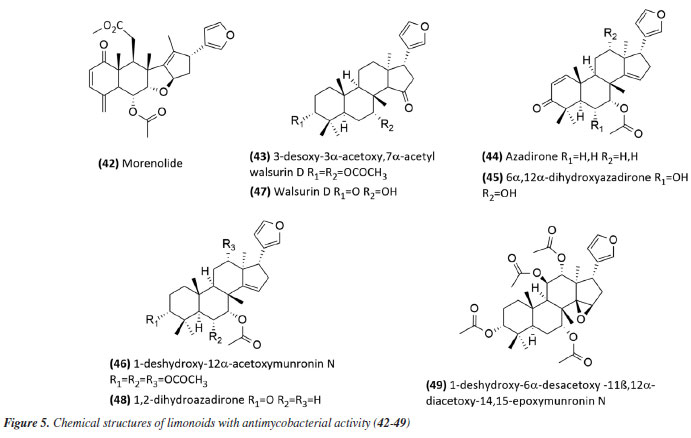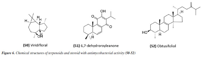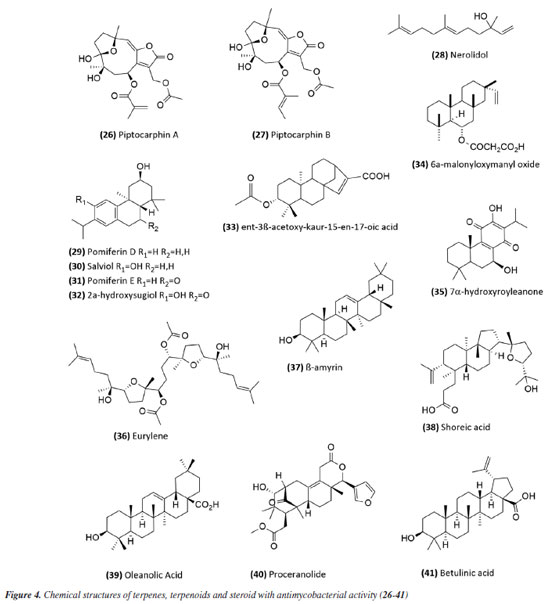 The species Aristolochia triangularis (Aristolochiaceae) collected in the region of Santa Maria, RS, Brazil, was also able to inhibit the mycobacterial growth of three different strains of Mycobacterium abscessus, M. fortuitum, and M. massiliense. Its samples: extract, fractions, and three isolated compounds presented MIC of 1 to 165.6 μg mL-1, with the compound nerolidol (28) (Figure 4) indicated as the most active with a MIC of 4.9 μg mL-1 against M. abscessus.58 In the study59 using the aerial parts of Mesosphaerum sidifolium to obtain extracts, four diterpenes were isolated and initially identified through insilico analysis. The compounds pomiferin D (29), salviol (30), pomiferin E (31), and 2a-hydroxysugiol (32) (Figure 4) demonstrated in vitro antituberculosis activity against M. tuberculosis H37Rv, with MIC values of 125 µM for pomiferin D and 2a-hydroxysugiol, and 250 µM for salviol and pomiferin E. A new labdane diterpenic acid named hyptenol, together with five other compounds: erythroxylol B, oleanolic acid acetate, betulinic acid, tormentic acid, and ent-3β-acetoxy-kaur-15-en-17-oic acid, were identified as chemical constituents of Leptohyptis macrostachys (Lamiaceae). In silico evaluations were performed to predict the antimycobacterial activity, and the in vitro MIC against M. tuberculosis H37Rv was determined. The results demonstrated that ent-3β-acetoxy-kaur-15-en-17-oic acid (33) (Figure 4) showed significant activity, with a MIC of 62.5 μM.60 Another three labdane-type diterpenoids, 6α-acetoxymanyl oxide, 6α-malonyloxymanyl oxide, and 6α-malonyloxy-n-butyl ester manoyl oxide, were isolated from the aerial parts of Stemodia foliosa (Scrophulariaceae) and tested against a panel of bacteria, including Mycobacterium smegmatis and M. phlei. The diterpenoid 6α-malonyloxymanyl oxide (34) was the most promising, showing activity against these strains with MIC values of 7 and 9 µg mL-1 for M. smegmatis and M. phlei, respectively.61 A study62 with Tetradenia riparia (Lamiaceae) isolated the compound 7α-hydroxyroyleanone (35) (Figure 4). This diterpenequinone showed potent inhibition against M. tuberculosis, with a MIC of 100 μg mL-1 for H37Rv, 50 μg mL-1 for isoniazid-resistant strains, and 25 μg mL-1 for rifampicin-resistant strains. This compound was subsequently obtained selectively and efficiently through high-speed countercurrent chromatography.63 A new triterpene, named millemaronol, was isolated from Homalolepis suffruticosa (Simaroubaceae), together with ten known metabolites: chaparrinone, scopoletin, 5-methoxyanthin-6-one, eurylene, hispidol A, hispidol B, nilocytin, α-dihydronylocytin, β-dihydronylocytin, and theurilene. The compounds, except for hispidol B, β-dihydronylocytin, and theurilene, were evaluated for their antimycobacterial activity against two strains of M. tuberculosis (H37Rv and M299). Eurylene (36) (Figure 4) showed the best MIC50 value for both strains, 1.4 ± 0.9 µg mL-1 for H37Rv and 2.0 ± 0.6 µg mL-1 for M299.64 In a study65 conducted with the extract of Passiflora mucronata (Passifloraceae) leaves, collected from the Jurubatiba restinga, the hexane fraction and the isolated triterpene β-amyrin (37) (Figure 4) showed activity against M. bovis BCG, with MIC50 values of 1.6 and 3.9 μg mL-1, respectively. The authors identified this species as promising and suggested further studies, including tests in infected macrophages and in vivo evaluations using a murine model of pulmonary tuberculosis. The same study also evaluated cytotoxicity and nitric oxide (NO) production in macrophages, reporting minimal toxic effects and inhibition of NO production at active antimycobacterial concentrations. In a study conducted by Leitão et al.,66 the triterpene shoreic acid (38) (Figure 4), isolated from the dichloromethane extract of Cabraleacanjerana (Meliaceae) leaves, exhibited a MIC of 100 µg mL-1 against M. tuberculosis H37Rv. In a subsequent study, Leitão and co-authors53 reported that oleanolic acid (39) (Figure 4), a triterpene isolated from the dichloromethane extract of the leaves of Lippia lacunosa (Verbenaceae), demonstrated a MIC of 50 µg mL-1 against the same strain. Four compounds isolated from the seeds of Cedrela fissilis, the triterpene piscidinol A and the limonoids andirolide N, mexicanalide, and proceranolide were able to inhibit the growth of M. tuberculosis, with emphasis on proceranolide (40) (Figure 4) presenting MIC50 of 37.6 ± 0.4 μg mL-1 for H37Rv and 44.9 ± 1.0 μg mL-1 for M299. Andirolide N and piscidinol A also demonstrated antimycobacterial activity: MIC50 of 60.1 ± 0.3 and 49.6 ± 0.5 μg mL-1 for H37Rv, respectively, and MIC50 of 50.4 ± 1.0 and 66.0 ± 1.0 μg mL-1 for M299, respectively. However, cytotoxicity evaluation revealed toxic effects for all compounds, except proceranolide (40) (Figure 4), which presented a less toxic profile.67 Another study68 evaluated the antimicrobial potential of betulinic acid (41) (Figure 4) extracted from the bark of Zizyphus joazeiro Mart. (Rhamnaceae). This pentacyclic triterpene demonstrated significant antimicrobial potential, inhibiting the growth of several microbial species, including M. tuberculosis, with a MIC value of 100 μM against the H37Ra strain. The study also employed molecular modeling to investigate the mechanism of action, indicating that betulinic acid targets essential bacterial resistance factors, such as DNA gyrase and beta-lactamase. Furthermore, predictive models estimated an activity of 63% against M. tuberculosis, confirming the efficacy of the compound and expanding its potential application. Continuing in the terpene class, the anti-inflammatory, antimycobacterial, and cytotoxic activities of several terpenoids isolated from the roots of Azadirachta indica (Meliaceae) were evaluated. All compounds tested showed potent NO inhibition (inhibitory concentration, IC50 < 15 μg mL-1). Antimycobacterial activity was assessed against M. tubercul