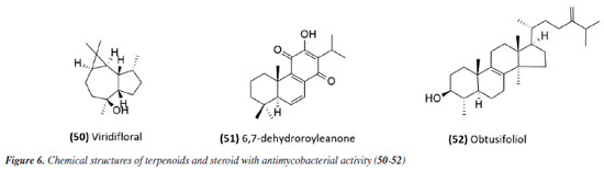 The antimycobacterial activity of the essential oil and the compound 6,7-dehydroroyleanone (51) (Figure 6) from leaves of Tetradenia riparia (Lamiaceae) against M. tuberculosis H37Rv strain and 19 other clinical isolates of M. tuberculosis (seven drug-sensitive, six isoniazid-resistant, and six MDR) suggested promising activity. The essential oil presented MIC values of 31.2 and 62.5 μg mL-1 depending on the strain (Table 2), while the isolated compound presented a MIC of 31.2 μg mL-1 against all strains evaluated (Table 1). Neither the essential oil nor the isolated compound presented significant toxic effects at the effective concentration, indicating SI values of 1.9 and 7.9, respectively.72 The essential oil extracted from the leaves and flowers of Callistemon viminalis presented a MIC of 62.5 and 100 μg mL-1, respectively, against the M. tuberculosis H37Rv strain (Table 2). Chemical analysis revealed that the principal constituent of both essential oils is 1,8-cineole (eucalyptol).73 Julião et al.74 described the antimycobacterial activity of essential oils extracted from the leaves of Lantanatrifolia L. and L. fucata (Verbenaceae), with a MIC of 80 and 100 μg mL-1, respectively, for M. tuberculosis H37Rv strain (Table 2). The composition of these oils is primarily composed of sesquiterpenes, with germacrane D being predominant in L. trifolia and β-elemene in L. fucata. In the study by Lima et al.,75 the potential of brown propolis essential oil was evaluated against the H37Rv strain of M. tuberculosis and the standard strain of M. avium. The oil presented a MIC of 50 and 62.5 μg mL-1 for the respective strains (Table 2), highlighting its potential as a source of antimycobacterial compounds. Another study76 evaluated the antimycobacterial activity of propolis. The essential oil of Brazilian green propolis presented a MIC of 64 μg mL-1 against the H37Rv strain of M.tuberculosis and a MIC of 62.5 μg mL-1 against the standard strain of M. avium (Table 2). The major constituents detected were carvacrol, acetophenone, spathulenol, (E)-nerolidol, and β-caryophyllene. The interaction between their bioactive compounds may result in synergistic effects, enhancing their antibacterial properties. The study highlights the need for in vivo investigations to elucidate the mechanisms of action and validate their therapeutic potential. The study conducted by Pinto et al.77 investigated the antimycobacterial activity of the essential oil from the leaves of Anemia tomentosa var. anthriscifolia (Anemiaceae), as well as its fractions obtained by liquid chromatography. The essential oil was characterized by gas chromatography (GC) and gas chromatography-mass spectrometry (GC-MS), where 60 compounds were identified, the main triquinane sesquiterpenes being (-)-epi-presylphiperfolan-1-ol (30.6%), silphiperfol-6-ene (14.7%), and presilphiperfolan-8-ol (8.3%). Among the 18 fractions analyzed, those containing unsaturated sesquiterpenes (A1 and A3) showed activity against M. tuberculosis H37Rv strain. Fraction A1 exhibited greater potency (MIC of 50 μg mL-1) (Table 2), suggesting that lipophilicity influenced the antimycobacterial activity. However, the fractions containing sesquiterpene alcohols (A5-A8) demonstrated MICs similar to the essential oil (MIC 100 μg mL-1) (Table 2). Fraction A18, rich in silphiperfolan-6β-ol (31.2%), was inactive against M. tuberculosis H37Rv at 100 μg mL-1. Extracts In a study78 evaluating immunological and microbiological activity, the hexane extract from the leaves of Davilla elliptica (Dilleniaceae) demonstrated significant antimycobacterial activity, with a MIC of 62.5 μg mL-1 against the H37Rv strain of M.tuberculosis. Furthermore, the extract induced a dose-dependent increase in the production of H2O2 (1.79 ± 0.23 to 20.5 ± 2.1 nmol), NO (2.64 ± 1.02 to 29.4 ± 5.9 µmol), and TNF-α (2.44 ± 1.46 to 41.6 ± 0.9 unit mL-1), suggesting a relevant immunomodulatory activation, as the macrophage-mediated immune response plays a crucial role in containing Mycobacterium tuberculosis infection. Stimulating the production of these inflammatory mediators can enhance the action of the immune system against the bacteria, making the hexane extract of Davilla elliptica a promising candidate for the development of new therapeutic strategies to combat tuberculosis. In a study79 investigating the antimycobacterial effect of leaves from 36 plants from the Atlantic Forest, the species Psychotria vellosiana (Rubiaceae), Cedrela fissilis (Meliaceae), Pouteria filipes (Sapotaceae), Plathymenia foliolosa (Fabaceae), and Peschieraaffinis (Apocynaceae) were active against M. tuberculosis H37Rv with MIC ranging between 3.12 and 20 μg mL-1. Peschiera affinis was the most promising species and did not present a significant toxic effect on mammalian cells. In 2010, the methanolic extract of aerial parts from Indigofera suffruticosa (Fabaceae) showed activity with a MIC of 125 μg mL-1 against M. tuberculosis H37Rv.80 In 2011, Morais et al.81 showed the antimycobacterial activity of ethanolic extract from leaves of 10 different species of Psychotria. All species studied inhibited the growth of the Mycobacterium bovis BCG strain. Among these, the extracts of P. pubigera, P. ruelliifolia, and P. stachyoides were the most active, presenting a MIC50 ≤ 4 μg mL-1. In this same study, the toxic effects and nitric oxide production in mammalian cells were evaluated. When analyzed together with the inhibition of M. bovis BCG, the species P.stachyoides stood out. The authors81 suggested that this activity is due to alkaloids, but further studies are needed. In 2015, the antimycobacterial activity described by Boligon etal.82 demonstrated the activity of extracts and fractions of the bark and leaves of Tabernaemontanacatharinensis (Apocynaceae) against strains of M. smegmatis, M. avium, and M. tuberculosis. The fractions obtained from the leaves were the most promising, with a greater sensi
