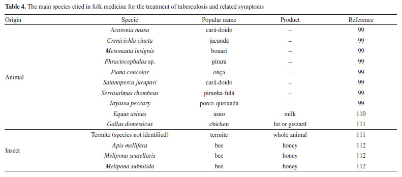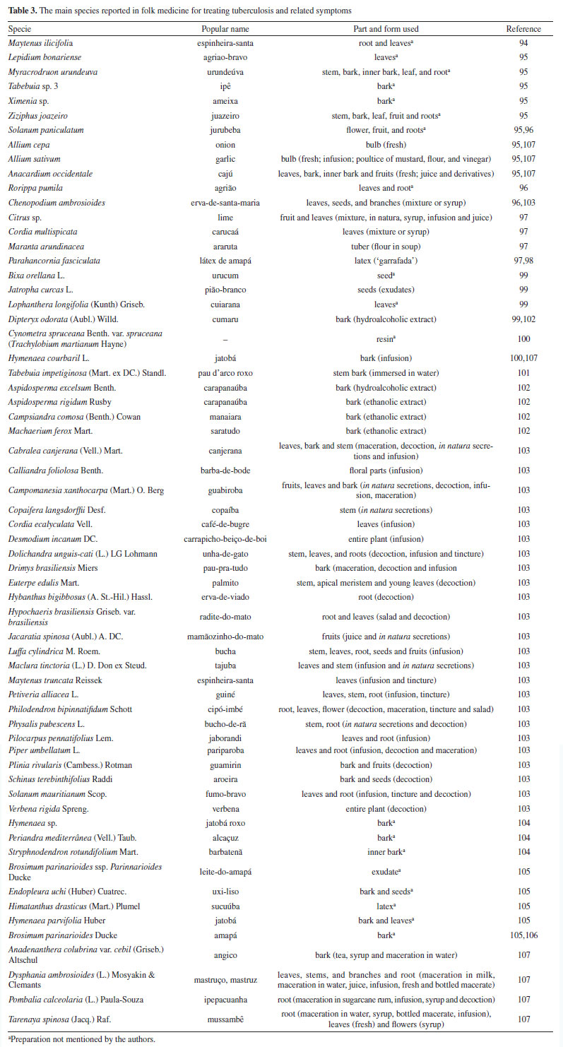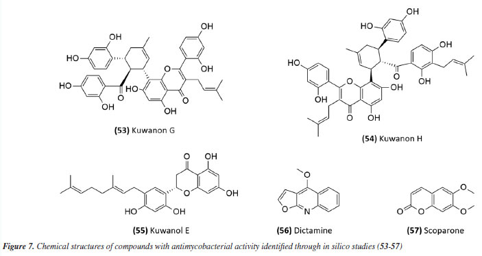 Mascarello et al.90 also conducted an in silico study with more than 800 natural compounds. Six compounds were shown to inhibit PtpB at micromolar concentrations, with kuwanol E (55) (Figure 7) exhibiting the highest inhibition value (Ki) of 1.6 ± 0.1 µM. In a study by Antunes et al.,91 molecular modeling was used to identify candidates for ligands of protein kinase serine/threonine (PknB) among constituents present in a Brazilian biodiversity database (NuBBE) through chemogenomics. Among the thirteen promising ligands, six had descriptions in the literature that supported this activity and were further studied for docking and molecular dynamics. The observed results demonstrated the potential of the alkaloid dictamine (56) and the coumarin scoparone (57) (Figure 7) as inhibitors of PknB and PknA. In addition, these compounds already have antimycobacterial activity described in the literature. The study of Taveira et al.92 addresses the bioinspired peptide CadeF2.1 G27-K44, derived from the defensins present in the fruits of Capsicum annuum (Solanaceae), which are natural antimicrobial peptides. Instead of being isolated directly from the plant, the peptide was synthesized based on the structure of the defensins found in C. annuum. The peptide presented a MIC50 of 33.2 μM for the standard strain H37Rv of M. tuberculosis and 55.4 μM for the hypervirulent strain M299 (Table 1). Even at high concentrations, cytotoxicity was low, suggesting that the peptide has a good safety profile for therapeutic use. Ethnobotanical approach to tuberculosis treatment Investigating antibacterials based on ethnobotanical knowledge and enabling the discovery of new natural products is also an interesting strategy, given the cultural and natural wealth of Brazil. Before the advent of antibiotic therapy, plants were widely used as antiseptic agents materials with antibacterial activity.93 Ethnopharmacological research contributes substantially to the medicinal knowledge of potentially essential species, and the reported species can be used to help guide chemical and biological studies aimed at proving therapeutic properties and isolating biologically active compounds, hopefully leading to a new drug candidate.93 The following ethnobotanical studies, conducted in Brazil, described the widespread use of plant species for treating tuberculosis and/or a group of diseases or symptoms related to the respiratory tract. The reported species, the popular names, and the parts used were listed in Table 3. In a study94 on the antimicrobial evaluation of the most commonly used species in Rio Grande do Sul (RS), the roots and leaves of Maytenus ilicifolia (Celastraceae) were cited for use in cases of tuberculosis, as well as for the treatment of conditions associated with microorganisms. In a review by Albuquerque et al.,95 the Caatinga (semiarid vegetation) was the target of study. The available published information on medicinal plants used by traditional communities was analyzed to contribute to future phytochemical and pharmacological investigations. In this study, eight species were reported for use in the treatment of tuberculosis, namely: Anacardiumoccidentale (Anacardiaceae), Myracrodruon urundeuva (Anacardiaceae), Tabebuia sp. (Bignoniaceae), Lepidium bonariense (Brassicaceae), Chenopodium ambrosioides (Amaranthaceae), Ximenia sp. (Olacaceae); Ziziphus joazeiro (Rhamnaceae), and Solanum paniculatum (Solanaceae), thus, highlighting the significant biodiversity of this Brazilian biome. In Brazil, another field of study is popular markets, which are public spaces where various types of products are sold and serve as venues for exchanging cultural information. Considering the lack of ethnobotanical studies in these markets and the significant methodological difficulties in obtaining access to this type of information, Albuquerque et al.96 conducted interviews with vendors in an important traditional market in the city of Recife (Pernambuco, northeastern Brazil) in two different years, 1995 and 2002. During this study, three species were indicated for the treatment of tuberculosis, namely: Rorippa pumila (Brassicaceae), Solanum paniculatum (Solanaceae), and Chenopodium ambrosioides. In interviews about widespread use, whether local, regional, or national, for the treatment of tuberculosis, coughs, colds, asthma, pneumonia, and respiratory diseases, the following species were cited: Parahancornia fasciculata (Apocynaceae),97,98 Bixa orellana, Dipteryx odorata (Fabaceae), Jatrophacurcas (Euphorbiaceae), Lophanthera longifolia (Malpighiaceae), Brosimum parinarioides ssp. Parinnarioides (Moraceae),99 Cynometra spruceana Benth. var. spruceana (Trachylobium martianum) (Fabaceae), Hymenaea courbaril (Fabaceae)100 and Tabebuia impetiginosa.101 In an ethnobotanical study102 conducted in the Amazon region with the quilombola community of Oriximiná, Pará, published in 2011, 43 plant species used by the community to treat symptoms related to tuberculosis were listed. Of these species, 10 were evaluated for their antimycobacterial activity against M. tuberculosis H37Rv. Five plant extracts, Dipteryx odorata, Campsiandra comosa (Fabaceae), Machaerium ferox (Fabaceae), Aspidosperma excelsum, and A. rigidium (Apocynaceae), were active with MIC ranging from 12.5-200 μg mL-1 (Table 2). The most active species was the ethanolic extract of the bark of Dipteryx odorata with a MIC of 12.5 μg mL-1 (Table 2). Only the five species listed above were included in Table 3; the complete list of 43 species can be accessed in the original publication. In 2015, a study103 on the use of medicinal plants in the region of the Parque Estadual da Cabeça do Cachorro in Paraná, Brazil, grouped the reported traditional knowledge into ten categories, one of which was infectious diseases, which includes symptoms such as fever, organs such as the lungs and different infectious diseases, including tuberculosis. Although it is not possible to state the sp