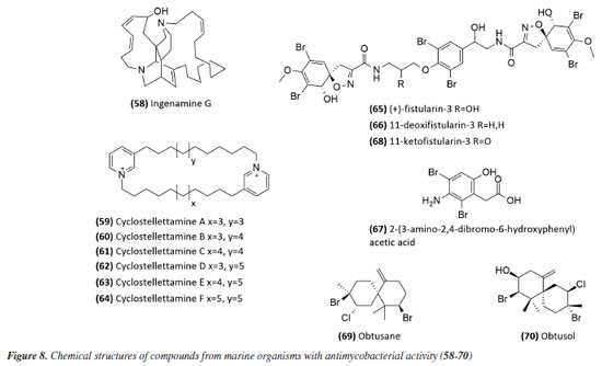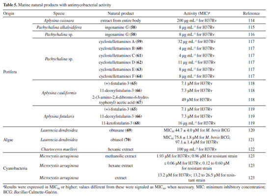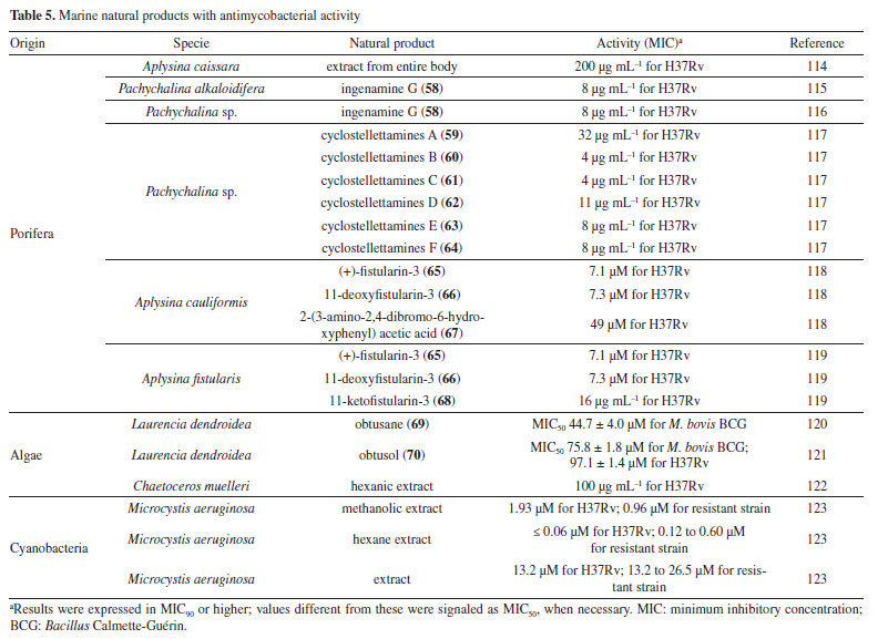Following studies with marine sponges, ingenamine G (58) (Figure 8), isolated from the methanolic extract obtained from Pachychalina sp., was evaluated for its antimicrobial potential, and its activity against the H37RV strain also showed a MIC value of 8 μg mL-1 (Table 5).116 In another study117 carried out with Pachychalina sp., it was possible to isolate cyclostellettamines A-F (59-64) (Figure 8) from the butanolic extract. These alkaloids were tested against the H37Rv strain and presented MIC values of 32, 4, 4, 8, 11, and 8 μg mL-1, respectively (Table 5). The study by Oliveira et al.118 carried out from a screening of 500 crude extracts of marine invertebrates, involved the isolation of four compounds containing bromine from the extracts with the most significant antimycobacterial potential. From the methanolic extract of Aplysina cauliformis, the compounds (+)-fistularin-3 (65), 11-deoxyfistularin-3 (66), and the 2-(3-amino-2,4-dibromo-6-hydroxyphenyl) acetic acid (67) (Figure 8) were isolated, which presented MIC values of 7.1, 7.3, and 49 μM for the H37Rv strain of M. tuberculosis (Table 5). Another species of the genus Aplysina had its anti-TB activity investigated. Three metabolites with antimycobacterial potential were isolated from the methanolic extract of Aplysina fistularis: fistularin-3 and 11-deoxyfistularin-3 with MIC values of 7.1 and 7.3 μg mL-1, respectively, and 11-ketofistularin-3 (68) (Figure 8) with a MIC of 16 μg mL-1 (Table 5). This was the first report of the antimycobacterial activity of the latter.119 Studies with the red alga Laurenciadendroidea have shown that extracts and isolated compounds may be promising sources for antimycobacterial activity. The active extracts yielded two active compounds: obtusane (69) (Figure 8) with a MIC50 of 44.7 ± 4.0 µM120 against M. bovis BCG and obtusol (70) (Figure 8) with a MIC50 of 75.8 ± 1.8 μM and 97.1 ± 1.4 µM against M. bovis BCG and M. tuberculosis H37RV, respectively121 (Table 5). This suggests that these samples are promising and can be used in macrophage infection models and animal models. Another study122 demonstrated the antimycobacterial activity of polyunsaturated fatty acids in the hexane extract of the marine diatom Chaetoceros muelleri. The hexane extract was the most active and presented a MIC of 100 μg mL-1 against the H37Rv strain of M. tuberculosis. 1H NMR (1H nuclear magnetic resonance spectroscopy) analysis revealed the presence of linoleic acid (LA), α-linolenic acid (ALA), eicosapentaenoic acid (EPA), and docosahexaenoic acid (DHA), suggesting that these lipid constituents may be responsible for the observed antimicrobial activity. These findings reinforce the potential of marine algae as sources of new candidates for drug development against bacterial infections, especially M. tuberculosis. Ramos et al.123 investigated the antimycobacterial activity of extracts of the RST 9501 strain of the cyanobacterium Microcystis aeruginosa. The methanolic extract presented a MIC of 1.93 μM against the H37Rv strain and 0.96 μM against resistant strains of M. tuberculosis (Table 5). The hexane extract demonstrated the highest activity, with MIC of ≤ 0.06 μM against H37Rv and between 0.12 and 0.60 μM against resistant strains (Table 5). 1H NMR analysis identified fatty acids such as linoleic acid, α-linolenic acid, eicosapentaenoic acid, and docosahexaenoic acid, suggesting its antimicrobial potential. Furthermore, the study evaluated a variant of the extract M. aeruginosa, the [D-Leu 1] MC-LR variant, which presented a MIC of 13.2 μM for susceptible strains and between 13.2 and 26.5 μM for resistant strains (Table 5). Regarding cytotoxicity, exposure of rat hepatoma cells (HTC) to the M. aeruginosa extract variant resulted in a significant decrease in cell viability at concentrations higher than 192.71 μM. These results indicate that the M. aeruginosa 9501 strain and its variant are promising candidates for developing new antimycobacterial agents. Other living organisms as a source of antimycobacterial activity Microorganisms have been a rich source of medicines. However, the range of microorganisms used as precursor sources is minimal compared to the diversity that exists worldwide, which is largely unknown. Only about 6,000 species of bacteria have been named (compared to over a million plant and animal species), and estimates suggest that there are approximately 1.5 million species of fungi, 1.5 million species of algae, and 1.5 million species of prokaryotes.124 Although streptomycin, obtained from cultures of the bacterium Streptomyces griseus, was the first effective antibiotic for treating tuberculosis and a milestone in the history of antibiotics, the first antibiotic, penicillin, had been discovered a few years earlier from fungi of the genus Penicillium.125 Currently, advances in research have provided new approaches to microorganisms in Brazil in search of small bioactive molecules to obtain potential antibiotics. The approach from fungi of different origins has also been investigated for antimycobacterial properties. Andrioli et al.126 evaluated the inhibition of mycobacterial growth of six compounds isolated from fungi against M. bovis BCG, three strains of M. tuberculosis, and three strains of M. kansasii. The compounds were isolated from the endophytic fungus Mycoleptodiscus indicus: austdiol, austdiol diacetate, mycoleptone A, and eugenitin. The compound emodin was isolated from the endophytic fungus Penicillium citrinum, and δ-lactam from the soil fungus Humicolagrisea. The compounds austidiol (71), mycoleptone A (72), and emodin (73) (Figure 9) showed promising activity against susceptible M. tuberculosis and clinical isolates, including a hypervirulent strain. Respectively, these compounds presented MIC50 values of 10.8, 9.2, and 5 µM against M. tuberculosis H37Rv (Table 6). Furthermore, the intracellular efficacy to reduce the growth of the H37Rv strain in infected 