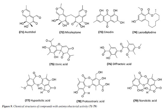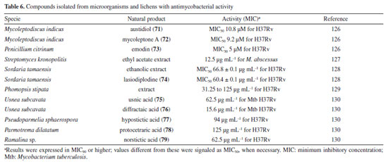 A study127 carried out with an ethyl acetate extract obtained from the culture of the bacterium Streptomyceskronopolitis in potato dextrose broth showed that this extract presented a MIC of 12.5 μg mL-1 against M. abscessus (Table 6). The bacterial sample used in this study was obtained from rhizosphere soil collected in São Luís, MA, Brazil. The compounds responsible for the observed effect were not identified. Ethanolic extracts of sixteen endophytic fungi obtained from the plant species Tocoyenabullata (Rubiaceae) and Humiria balsamifera (Humiriaceae) were evaluated for antimycobacterial activity against M. tuberculosis H37Rv. The most active extract was from the fungus Sordaria tamaensis, with a MIC50 of 66.8 ± 0.1 μg mL-1 (Table 6). The macrolide lasiodiplodine (74) (Figure 9) was isolated from this extract, presenting a MIC50 of 60.4 ± 0.1 μg mL-1 (Table 6). Furthermore, lasiodiplodine inhibited the intracellular growth of M. tuberculosis and was not cytotoxic to macrophages. C57BL/6 animals infected with M. tuberculosis treated with lasiodiplodine had reduced bacillary load and lung pathology. Fructose 1,6-bisphosphate aldolase class IIa was predicted to be the hypothetical target for lasiodiplodine.128 Prince et al.129 isolated the fungus Phomopsis stipata B. Sutton (Diaporthaceae) from the leaves of the plant species Styrax camporum Pohl (Styracaceae). They evaluated the antimycobacterial efficacy against M. tuberculosis H37Rv of its extracts grown in different culture media: yeast medium, potato dextrose broth, Czapek medium, nutrient broth, and a homemade corn medium. Among these, the extracts grown in homemade corn medium (MIC of 31.25 μg mL-1) and in potato dextrose broth medium (MIC of 62.5 μg mL-1) stood out (Table 6), which are satisfactory values considering that they are crude extracts. Notably, these extracts yielded the highest amount. For the other samples, the MIC values were: 125 μg mL-1 for the extract obtained in Czapek medium and 250 μg mL-1 for the extracts obtained in yeast medium and nutrient broth. In a study130 evaluating the antimycobacterial activity of compounds isolated from lichens, five compounds stood out with MIC lower than 250 μg mL-1. Usnic acid (75) and diffractaic acid (76) (Figure 9) isolated from Usnea subcavata presented MIC of 62.5 and 15.6 μg mL-1, respectively (Table 6). Hypostictic acid (77) (Figure 9) isolated from Pseudoparmelia sphaerospora presented a MIC of 94 μg mL-1 (Table 6). Protocetraric acid (78) (Figure 9) isolated from Parmotrema dilatatum presented a MIC of 125 μg mL-1, and norstictic acid (79) (Figure 9) isolated from Ramalina sp. presented a MIC of 62.5 (Table 6). Thus, this demonstrates the capacity of other natural sources also to be a source of compounds with antimycobacterial activity.