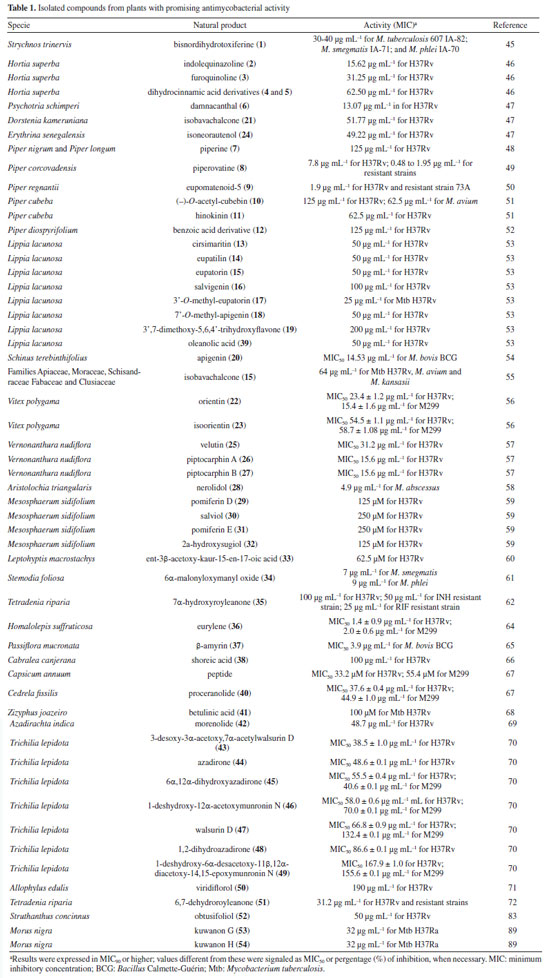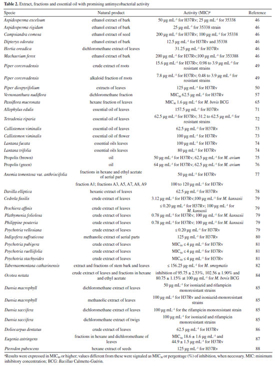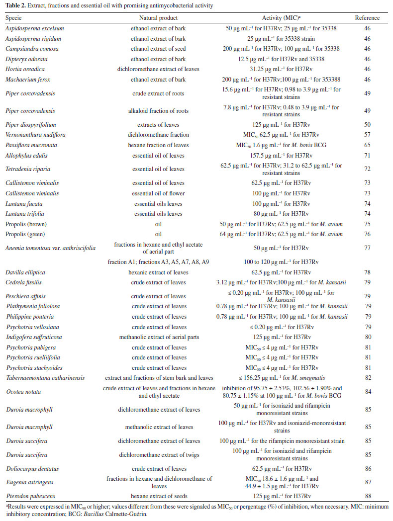 CONCLUSIONS The possibility of treating tuberculosis using natural products is remarkable, and continuing to search for new bioactive molecules that make this treatment more efficient is essential, given the immense biodiversity present in Brazil. This research has made it possible to find several studies in this line of research, carried out by Brazilian researchers. Still, the number of strategies that move forward is low, highlighting the importance of continuing these studies. Another point that deserves to be highlighted is the investment in infrastructure for scientific research in a high-level biological containment environment, essential for working in vitro and in vivo with Mycobacterium tuberculosis (biosafety level 3). Given the existence of Brazilian groups committed to this search, receiving greater attention and government incentives will make the continuation of these studies more viable. Furthermore, this review contributed to highlight promising studies to encourage future investigations to identify highly active antimycobacterial natural products from extracts, as well as to deepen the knowledge of natural products already identified as promising, characterizing them as new candidates for antituberculosis prototypes, including the synthesis and optimization of new analogues of natural products with antimycobacterial potential.