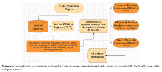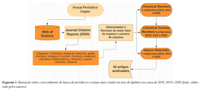 METODOLOGIA Organizado como uma pesquisa bibliográfica,32,33 este estudo atendeu aos procedimentos de: (a) escolha do tema; (b) levantamento bibliográfico preliminar; (c) formulação do problema; (d) elaboração do plano provisório do assunto; (e) busca das fontes; (f) leitura do material; (g) fichamento; (h) organização lógica do material; e (i) redação do texto.33 Por meio dos procedimentos iniciais, a introdução abriu com uma discussão que problematiza aspectos da inovação na Química para, na sequência, estabelecer um ensaio analítico de artigos científicos da área. A análise iniciou em novembro de 2021, na base Web of Science, no Journal Citation Reports (JCR) 2020, em que foi possível identificar os três periódicos com maior fator de impacto (FI) e com elevado número de citações na área da Química em 2020, analisando, para tanto, seus artigos nos anos de 2018 a 2020. A escolha pela limitação a três periódicos de maior FI foi arbitrária, uma vez que a pesquisa tem seu foco qualitativo, mas orientada tanto pelo tempo do estudo quanto pela proposta de analisar uma dispersão em uma amostra limitada e legitimada pela comunidade científica. Os artigos aqui analisados somam 35.838 citações (nas respectivas datas de consulta), o que mostra sua circulação massiva na comunidade. Foram selecionados, então, 45 artigos, todos de revisão. Ainda que os critérios iniciais não tenham limitado a esse tipo de material, esse resultado evidencia que a tipologia de texto que mais se alinha aos critérios utilizados é a de revisão. Assim, se, por um lado, no quesito quantitativo de seleção há um possível limite da pesquisa, por outro se evidencia que os textos analisados tanto têm grande aceitação pela comunidade quanto também, abordam e reúnem em suas discussões outros textos. Nesse sentido, fica a possibilidade para estudos futuros na própria comunidade confrontarem as discussões aqui propostas. Uma vez que na estratégia metodológica adotada um dos critérios centrais é o FI, cabe explicitá-lo. Sua definição é dada como a “razão entre o total de citações recebidas, naquele ano, pelos artigos publicados nos dois últimos anos e o número de artigos publicados nesses dois anos. Entretanto, a janela temporal do cálculo do FI pode ser calculada para períodos maiores, como três ou cinco anos".34 Dessa forma, o FI foi escolhido por ser um dos indicadores mais utilizados quando a finalidade é mensurar o destaque e a visibilidade de periódicos científicos, comumente reconhecidos como importantes ferramentas para aferir e disseminar a pesquisa e o desenvolvimento, caracterizando-se, assim, como uma das vertentes da inovação.30,35,36 Além disso, é um importante parâmetro que costuma interferir na distribuição de recursos para a pesquisa e na avaliação do conhecimento produzido pela Ciência, inclusive em nível internacional.36,37 No processo de busca das revistas de maior FI, foram selecionadas as seguintes categorias: chemistry, analytical; chemistry, applied; chemistry, inorganic&nuclear; chemistry, medicinal; chemistrymultidisciplinary; chemistry, organic; chemistry, physical. Essa metodologia resultou na seleção dos periódicos Chemical Reviews (FI 60,622)38 Chemical Society Reviews (FI 54,564)39 e Nature Materials (FI 43,841).37,40 Na sequência, com a intenção de selecionar os cinco textos mais citados nos anos de 2018 a 2020, em cada um dos três periódicos de maior FI, foram identificados 45 artigos de revisão, conforme representado no Esquema 1. O marco temporal de 2018 a 2020 foi determinado em função do período inicial da pesquisa bibliográfica, considerando ademais que a inovação necessita um tempo de reconhecimento por parte do processo científico para a avaliação de sua relevância. Além disso, a delimitação da amostra de 45 artigos científicos, a partir do recorte historicamente situado, ocorreu em função do tempo disponível de análise e da complexidade das constantes reorganizações dos resultados.