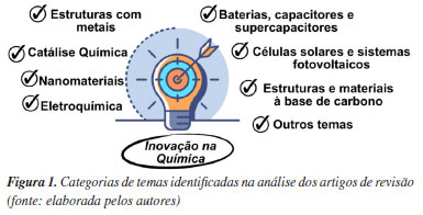 Por fim, de modo complementar, e articulada à estratégia metodológica, houve a leitura do material, seu fichamento e organização. Na etapa de fichamento, foram determinados os pontos relevantes de observação em cada texto: (i) conhecer os principais temas abordados; (ii) compreender o que existe e pode ser considerado inovador; e (iii) as possibilidades de contribuição para as pesquisas em Química e de aplicação em questões emergentes à/na sociedade. Nesse sentido, a partir da análise dos títulos, resumos, introduções e considerações finais (apresentadas, muitas vezes, como perspectivas futuras relacionadas aos campos investigados nos estudos de revisão analisados), procedeu-se à identificação dos principais temas e enfoques dos artigos. Em função da variedade de relações temáticas, por fim, considerou-se como critério a busca por palavras e termos comuns presentes nos títulos dos artigos, como forma de organização do material, o que possibilitou a criação de oito categorias: estruturas contendo metais; catálise química; nanomateriais; eletroquímica; baterias, capacitores e supercapacitores; células solares e sistemas fotovoltaicos; estruturas e materiais à base de carbono; e outros (vide Figura 1).