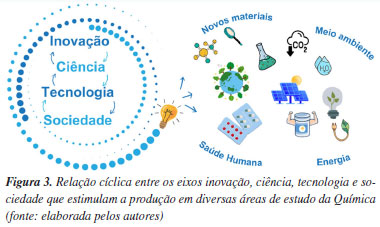 CONCLUSÕES A partir da busca por contemplar um ensaio, que proporcionou uma maior compreensão sobre o que existe e pode ser tomado como uma inovação química em um contexto mais recente, a análise sobre os artigos possibilitou a formulação de algumas considerações, especialmente a de que existem algumas temáticas amplamente citadas pela comunidade científica. Essa é uma característica própria da Ciência, a de utilizar como base as teorias e os conhecimentos já descritos para formular novas inferências e constatações, construindo, assim, novos conhecimentos, ou ainda, corroborando, reformulando, aprimorando ou até mesmo refutando conhecimentos científicos existentes.42 Nesse contexto, as temáticas emergem das demandas, oriundas do meio social, ambiental ou científico (para a resolução de problemáticas, por exemplo), e da própria inovação que propicia a elaboração de outros materiais ou serviços com finalidades específicas, por meio da elaboração de novos conhecimentos e produtos que, de alguma forma, têm impacto no desenvolvimento da tecnologia e na inovação para a Ciência. Em outras palavras, ao influenciar e sofrer influências “na" e “da" comunidade científica e social, percebe-se que gradualmente a inovação passa a não ter apenas o caráter de atender demandas, uma vez que também influencia no processo de construção da Ciência (por meio do direcionamento a programas de pesquisa), sendo que, em alguns casos, não gera apenas produtos e métodos, mas novas demandas.66 A partir dos 45 artigos analisados, foi possível identificar temáticas e discussões relevantes na atualidade, impulsionados por investigações que se centram no intuito de promover melhorias e estudos relacionados ao ambiente e à sustentabilidade, ao avanço e ao desenvolvimento tecnológico, à saúde humana, ao mercado e ao próprio progresso do conhecimento científico em si. Portanto, as inovações surgem não apenas para gerar novas aplicações práticas à sociedade, ou então, para contribuir com a economia e responder a demandas estabelecidas, mas também para contribuir em novos direcionamentos da pesquisa científica e tecnológica, produzindo e aprimorando novos saberes. Dessa forma, é possível concluir que a inovação não está presente apenas na criação de novos produtos, já que se ocupa também de temas e questões que há muito são estudados, mas que ainda são discutidos em função de sua relevância científica. Surge atrelada, principalmente, ao desenvolvimento de novas, criativas e originais metodologias, ao aprimoramento de (novas) rotas sintéticas, capazes de potencializar as propriedades desejáveis de produtos e/ou métodos, e também, ao aprimoramento de técnicas e métodos que possibilitam o avanço científico sobre o que já é parcialmente conhecido. Nesse sentido, o progresso e a inter-relação constante da Ciência e da Tecnologia leva a inter-relações com e na sociedade,31 e no futuro do planeta, e que pode (ou não) resultar em melhorias na qualidade de vida, no meio ambiente e na saúde humana, assim como em novas tecnologias e em meios para torná-las mais acessíveis. Nesse contexto, quando esses impactos produzidos são passíveis de avaliação e certa validação por parte da sociedade e/ou comunidade científica, pode-se dizer que a inovação se concretiza e se torna palpável. Isso implica na relevância das temáticas, brevemente apresentadas neste artigo, que constituem propostas de formação de nível escolar a universitário e/ou de divulgação científica, e que buscam viabilizar a inserção da sociedade no debate, nas escolhas e na compreensão sobre como a ciência química funciona no cotidiano e como pode impactar o planeta. Por fim, vale destacar um ato reflexivo: a inovação, que pode ser definida como a introdução de novidades a determinados sistemas, métodos, técnicas ou produtos, com a intencionalidade de aprimorá-los, atribui melhorias ao setor onde costuma se estabelecer, pois surge através do avanço científico e tecnológico, com impacto na sociedade.61,62,67 No entanto, ao mesmo tempo que surge em função da Ciência, da Tecnologia e da Sociedade, também as influencia, a ponto de se inter-relacionarem,31 ao que cabe à Inovação se resguardar a fim de não comprometer a autonomia da Ciência, sobretudo quando embasada apenas no impacto proveniente da geração de capital e da economia.15,22,68 Por isso, sugere-se cautela quando se busca analisar o que pode ser considerado, de fato, uma inovação, ou então, um legítimo avanço científico capaz de auxiliar no desenvolvimento de melhorias. Logo, saber diferenciar essas contribuições é necessário, sobretudo quando o termo “inovação" é usado apenas como uma forma de deslumbramento pelo mercado.