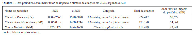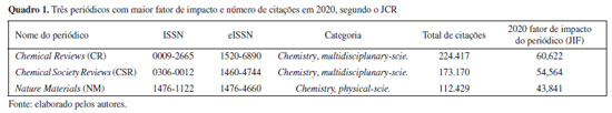 O contexto dos periódicos e os artigos selecionados Os três periódicos selecionados, Chemical Reviews, Chemical Society Reviews e Nature Materials, têm elevado fator de impacto e alto número de citações, conforme consta no Quadro 1.