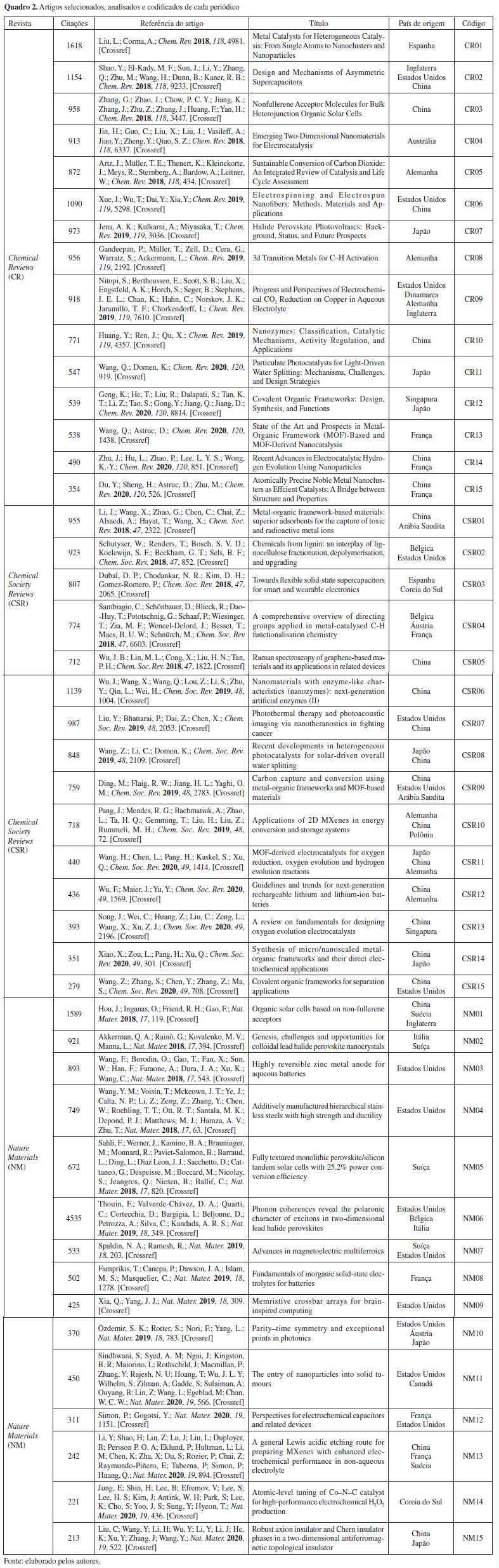 O periódico Chemical Reviews apresenta o maior número total de citações (224.417) e o maior fator de impacto (60,622) relacionados à área geral da Química, em 2020.38 É indexado nas bases de dados: Web of Science, SCOPUS, CAS, PubMed, SwetsWise, Proquest, EBSCOhost, CABI e British Library, e publica duas edições por mês sobre artigos de revisão em temas específicos.38 É possível considerá-lo um dos mais conceituados em Química. Centra-se em publicações capazes de realizar revisões abrangentes de temas relevantes e que possam contribuir com pesquisas recentes e inovadoras nas áreas de química orgânica, inorgânica, analítica, física, teórica e biológica.38 O segundo periódico com maior fator de impacto (54,564) e número total de citações (173.170) em 2020 foi o Chemical Society Reviews.39 É a principal publicação de revisões científicas lançada pela Royal Society of Chemistry, uma organização que acredita que, ao reunir e socializar ideias e informações científicas, contribui para grandes descobertas e inovações na Ciência.39 Publica duas edições mensais e, ocasionalmente, edições temáticas. É destinada às Ciências Químicas, com tópicos interdisciplinares, que podem incluir: química inorgânica, química analítica, biomateriais, bioorgânica/química medicinal, catálise, química de coordenação, biologia química, engenharia de cristais, energia, química verde, sustentabilidade, materiais inorgânicos, química do grupo principal, nanociência, química orgânica, materiais orgânicos, organometálicos, físico-química, química supramolecular, metodologia sintética, química teórica e computacional.39 O terceiro periódico com o terceiro maior fator de impacto (43,841) e elevado número de citações (112.429) foi o Nature Materials.40 De periodicidade mensal, reúne pesquisas relevantes sobre a Ciência e a Engenharia de Materiais, área que apresenta um grande impacto na construção dos conhecimentos de Química, Física e Biologia.40 Publica investigações que descrevem os avanços relacionados à síntese, processamento, estrutura, composição, propriedades e desempenho de materiais, os quais apresentam novos constituintes químicos, projetados e manipulados para fins de inovação e tecnologia, a fim de impulsionar novas descobertas e o aprimoramento de conceitos, contribuindo assim, para o desenvolvimento da sociedade.40 As áreas que fazem parte do escopo do periódico são: engenharia e estrutura da matéria, materiais orgânicos, materiais biomédicos e biomoleculares, materiais ópticos, fotônicos e optoeletrônicos, materiais magnéticos, materiais supercondutores, materiais catalíticos e de separação, materiais e processos em nanoescala, computação, modelagem e teoria dos materiais, superfícies e filmes finos, técnicas de design, síntese, processamento e caracterização. Em suas páginas, estampa artigos primários, de revisão, comentários, notícias e outras formas de expressão da comunidade científica.40 A partir dos três periódicos foram selecionados os cinco artigos mais citados em cada um deles, nos anos de 2018, 2019 e 2020, totalizando 45 artigos analisados. Cada artigo é codificado por meio da inicial do periódico e de um numeral (vide Quadro 2).