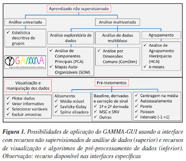 INTERFACE GRÁFICA Neste segundo tutorial, serão realizadas aplicações práticas utilizando outras interfaces do aplicativo GAMMA-GUI. O aplicativo, juntamente com os conjuntos de dados usados como demonstração neste tutorial, está disponível para download no GitHub20 ou no file Exchange da MathWorks.19 Para a instalação do GAMMA-GUI utilizando a opção do GitHub, os usuários devem consultar as instruções no nosso primeiro tutorial.17 A instalação utilizando a versão do File Exchange é mais simples e pode ser realizada diretamente no Matlab. Para isso, basta que os usuários abram o arquivo executável baixado do site do file Exchange. Após o processo de instalação, o aplicativo pode ser executado ao apertar o botão "GAMMA" na aba "APPS" do Matlab, conforme o vídeo de instalação.41 O aplicativo foi testado nas versões do software Matlab R2022a a R2024a. Para sua íntegra utilização, requer funções dos toolboxes "Global Optimization Toolbox", "Optimization Toolbox", "Statistics Machine Learning Toolbox", "Bioinformatics Toolbox" e "Signal Processing Toolbox". Para usuários que não têm acesso à licença do Matlab, alguns recursos do aplicativo GAMMA-GUI podem ser utilizados através da versão online do Matlab (observação: nessa modalidade, o uso é restrito ao ambiente online, com um limite de 20 h mensais de utilização). O processo começa com a criação de uma conta no site da MathWorks42 utilizando um e-mail institucional. Em seguida, basta fazer o download e a instalação do aplicativo através da aba "APPS" no Matlab Online, conforme as instruções detalhadas disponíveis em nosso Instagram.43 Conhecendo as interfaces do GAMMA-GUI Na interface "Visualização e pré-tratamentos", os usuários têm a possibilidade de realizar a visualização, manipulação e pré-tratamento de dados (Figura 1Sa, Material Suplementar). Nessa interface, os usuários podem plotar os dados, selecionar variáveis, excluir amostras ou ainda aplicar diferentes algoritmos de pré-processamentos nos dados. Existem diversas opções de algoritmos disponíveis na literatura, e no GAMMA-GUI os usuários têm as principais metodologias para análise multivariada, entre elas o alisamento pela média móvel, com filtro de Savitsky-Golay e Spline alisadora, técnicas de derivadas, correção de sinal MSC (multiplicative scatter correction) e SNV (standard normal variate), correção de linha de base e interpolação. Enquanto na interface "Análise Exploratória", os usuários têm a possibilidade de utilizar diferentes estratégias não supervisionadas de análises de dados, tais como HCA, PCA, SOM, k-means e ComDim (Figura 1Sb, Material Suplementar).