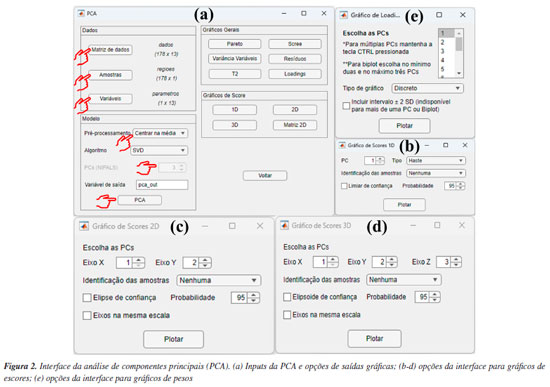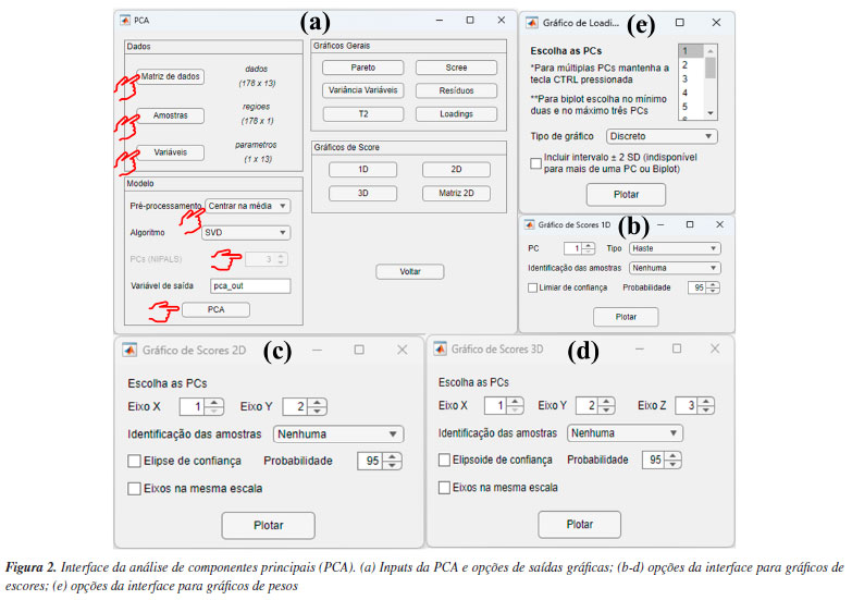 DEMONSTRAÇÕES USANDO O GAMMA-GUI Neste segundo artigo tutorial, concentramos nossas demonstrações usando as interfaces "Análise Exploratória" e "Visualização e pré-tratamentos". Para isso, diferentes conjuntos de dados foram selecionados do banco de dados do Matlab, dos autores e da literatura para demonstrar as aplicabilidades e funcionalidades do aplicativo. Neste tutorial, fornecemos aos usuários um passo a passo dos procedimentos adequados que devem ser seguidos para a análise não supervisionada de dados, assim como a interpretação dos resultados obtidos, utilizando uma interface gráfica amigável e livre de programação. Cabe ainda salientar que recursos extras do uso do aplicativo podem ser encontrados em nosso canal no YouTube, através de vídeos tutorias.18 Ressaltamos também que a utilização do GAMMA-GUI por usuários iniciantes também é recomendada e fomentada pelos desenvolvedores do aplicativo, desde que os usuários busquem alguns conhecimentos prévios sobre o assunto antes da sua utilização. PCA Adiante, demonstramos passo a passo como realizar e interpretar os resultados da PCA. Entretanto, é fundamental que, antes da etapa de análise, os usuários organizem os dados da matriz X da seguinte maneira: as linhas devem ser compostas pelas amostras e as colunas pelas variáveis. Nesse exemplo demonstrativo, utilizamos um conjunto de dados que consiste em 13 parâmetros físico-químicos determinados de 178 amostras de vinhos de diferentes regiões vinícolas italianas denominadas: Barolo (O), Grignolino (G) e Barbera (E).44 A matriz X para esse conjunto de dados é dada por I linhas que correspondem às amostras de vinhos × J colunas correspondem aos parâmetros físico-químicos, gerando uma matriz com dimensões 178 × 13, disponível no material de demonstração "dados_vinho" e YouTube.45 Ao carregar o material de demonstração no Matlab, os usuários terão acesso a uma série de estruturas disponíveis no workspace, como a matriz "dados", que contém os valores dos parâmetros físico-químicos determinados nos vinhos; três vetores de caracteres "nomes", "regioes" e "parametros", que contêm, respectivamente, os nomes completos das regiões vinícolas, as regiões vinícolas abreviadas de cada amostra de vinho e os nomes dos parâmetros físico-químicos determinados. Nesta demonstração, optamos por abreviar os nomes das regiões vinícolas para facilitar a interpretação e a visualização nas saídas gráficas da PCA. Iniciaremos a análise abrindo a janela "Análise Exploratória" do GAMMA-GUI e apertando o botão "PCA". Após essa etapa, uma nova janela se abrirá, onde os usuários precisam definir os inputs para realizar a análise, selecionando a matriz de dados e os vetores que identificam as amostras e variáveis na interface do aplicativo, utilizando os botões "Matriz de dados", "Amostras" e "Variáveis", conforme mostrado na Figura 2a. Ao apertar cada um desses botões, uma nova janela "Selecione as variáveis" será aberta, e, em cada uma delas, os usuários precisam definir adequadamente a matriz de dados e os vetores que identificam as amostras e variáveis. Neste caso, após apertar o botão "Matriz de dados", a estrutura "dados" deve ser selecionada, no botão "Amostras" selecionar "regioes" e, em "Variáveis", selecionar "parametros", como ilustrado na Figura 2a. Cabe ainda salientar que os vetores que identificam as amostras e variáveis devem estar no formato "cell array", onde cada célula pode conter qualquer tipo de dado. Aqui, essas estruturas contêm as informações dos nomes abreviados das regiões vinícolas italianas, representadas pelo vetor "regioes", e nomes dos parâmetros físico-químicos (álcool, ácido málico, cinzas, alcalinidade das cinzas, magnésio, fenólicos totais, flavonoides, fenólicos não flavonoides, proantocianidinas, intensidade de cor, matriz de coloração "hue", oxigênio dissolvido e prolina), representados pelo vetor "parametros".