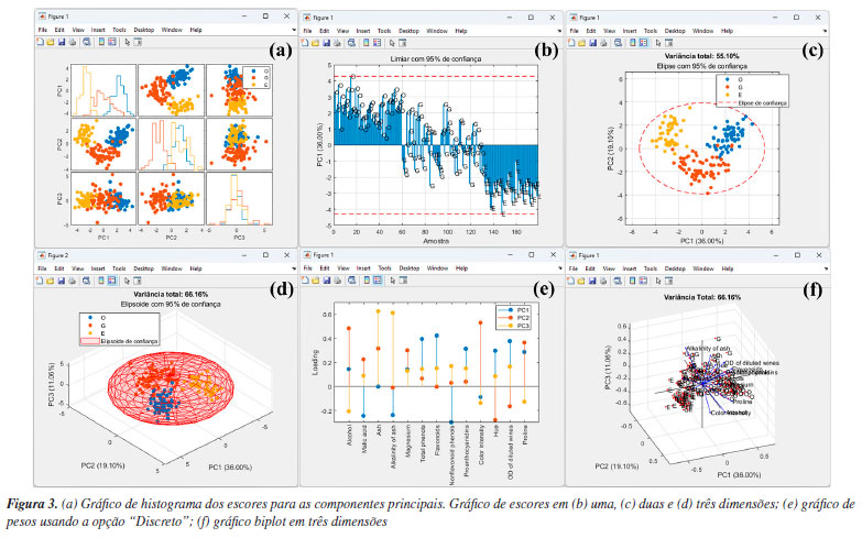 Na etapa seguinte, os usuários devem definir o tipo de pré-tratamento que será aplicado nas variáveis - colunas da matriz X usando o botão "Pré-processamento". Esse procedimento é essencial em qualquer análise quimiométrica, pois facilita a detecção e identificação de padrões e características relevantes nos conjuntos de dados químicos.1 Entre as opções de pré-tratamentos, o autoescalamento e a centragem na média estão entre os mais usuais. Neste exemplo, o autoescalamento é o procedimento mais recomendável, pois as variáveis têm diferentes unidades ou amplas faixas de variações. Nesses casos, ao aplicar esse procedimento, iguala-se o impacto entre as variáveis, ou seja, dá-se a mesma importância para todas as variáveis do conjunto de dados. Para a seleção do tipo de pré-tratamento no GAMMA-GUI, os usuários devem selecionar no botão "Pré-processamento", e escolher a opção "Autoescalamento". Agora, se o objetivo do usuário for avaliar dados espectrais, é preferível a aplicação da opção "Centragem na média", pois, ao centralizar os dados na média, a estrutura dos dados é preservada e a direção de maior dispersão ao redor dessa média coincide com a direção de maior variância interna dos dados, ou seja, as coordenadas são movidas para o centro dos dados, permitindo que as diferenças entre as variáveis se tornem mais perceptíveis.3,23,30 Existem ainda outras estratégias de pré-tratamentos, tais como o escalamento pela variância, pela amplitude, e variações de autoescalamento, como o autoescalamento de Pareto, VAST (variable stability) e nivelamento, entre outros.3 Além das etapas de pré-tratamento aplicadas às colunas da matriz X, existe ainda a possiblidade de pré-tratamento aplicado às linhas da matriz X, ou seja, às amostras que compõem o conjunto de dados. Estudos que envolvem dados espectrais, na maioria dos casos, requerem determinadas etapas de pré-processamento com o uso de algoritmos específicos. Frequentemente, estas etapas são aplicadas para minimização de informações indesejadas em dados espectroscópicos, como a correção do deslocamento da linha de base e fase/inclinação, correção de efeitos de espalhamentos em espectros de infravermelho próximo ou médio, ou variações em espectros de Raman e UV-Vis, ou ainda correções de deslocamentos em espectros de RMN ou cromatogramas desalinhados, entre outros tipos de correções existentes. Maiores detalhes podem encontrados na obra de Ferreira.3 Caso os usuários necessitem aplicar tais recursos em seus dados, na interface "Visualização e pré-tratamentos" do GAMMA-GUI (Figura 1Sa), os usuários têm a disponibilidade de escolher opções de alisamento, derivadas, correção de sinal, linha de base e interpolação de dados. Entretanto, se os usuários precisarem alinhar os dados no eixo das ordenas, como frequentemente é requerido em espectros de RMN ou cromatogramas, uma ótima ferramenta é o icoshift (interval-correlation-shifting),46 um algoritmo de código aberto para Matlab, disponibilizado para download em Chemometrics Research.47 A etapa seguinte consiste em definir o algoritmo e o número de componentes principais usando os botões "Algoritmo" e "PCs", respectivamente. No GAMMA-GUI, os usuários têm disponível as opções "SVD" (singular value decomposition) ou "NIPALS" (nonlinear iterative partial least squares) para o cálculo das matrizes de escores e de pesos. Neste exemplo, escolhemos o SVD, pois é considerada uma opção mais acurada e estável para cálculos das componentes principais. Para aplicações em que a matriz X possui muitas colunas e um posto químico pequeno (ou seja, alta correlação entre as variáveis), o NIPALS é recomendável, pois os vetores dos pesos e dos escores são calculados iterativamente, um de cada vez, o que reduz o tempo e esforço necessários para o processamento dos dados.3,23,30 O NIPALS é particularmente indicado para conjuntos de dados muito grandes, especialmente quando a análise é realizada em sistemas computacionais mais modestos, nos quais a decomposição SVD pode exigir uma quantidade elevada de memória. Para o algoritmo SVD, serão calculadas todas as PCs possíveis. Após a definição das etapas anteriores, é hora de realizar a análise, apertando o botão "PCA". Se os usuários desejarem, na caixa "Variável de saída", têm a liberdade de criar suas próprias nomenclaturas. Contudo, como default, a estrutura de saída dos dados é definida como "pca_out". Na estrutura de saída "pca_out" (default), os usuários têm à disposição uma série de recursos, como o acesso a matriz de escores "T", matriz de pesos "P", matriz de resíduos "Residuos", variância explicada "explained", teste de Hotelling's "T2" (mais informações sobre T2 são fornecidas adiante), entre outros. Os usuários também podem ainda gerar gráficos, acessando as opções "Gráficos Gerais" e "Gráficos de Score", ver Figura 2. Algumas opções de "Gráficos Gerais" estão ilustradas na Figura 2S (Material Suplementar), como o gráfico de "Pareto" (Figura 2Sa), "Scree" (Figura 2Sb), "Variância Variável" (Figura 2Sc) e "T2" (Figura 2Sd). Existe ainda, a opção de plotar o gráfico de resíduos, que não é demonstrado neste exemplo. A análise simultânea dos gráficos das Figuras 2Sa e 2Sb possibilita a definição do "posto químico" da matriz, ou seja, o número mínimo de novas variáveis capazes de descrever a máxima informação dos dados originais após a compressão. Essas novas variáveis são denominadas componentes principais, ou ainda fatores ou autovetores.3 De acordo com a Figura S2b, os autovalores apresentam uma redução significativa a partir de quatro a cinco PCs. Para este conjunto de dados, utilizamos também o conhecimento prévio do problema para determinar o número de A PCs a serem consideradas. Sabemos que há três origens geográficas distintas para os vinhos, o que nos perm