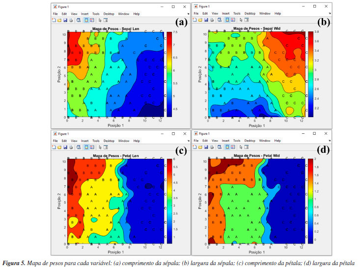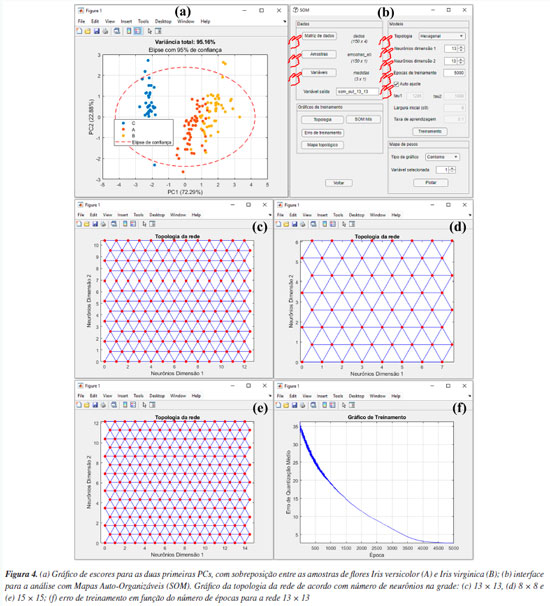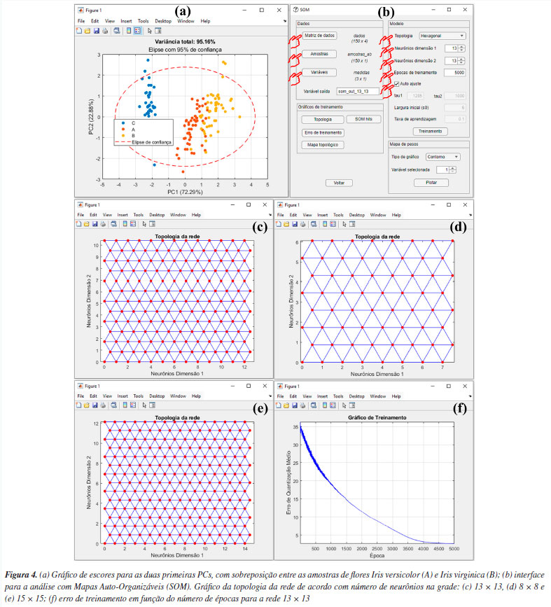 É recomendável iniciar a análise dos resultados da PCA através da análise dos gráficos de escores. Os usuários têm a possibilidade de gerar gráficos de escores em uma "1D", duas "2D" ou três dimensões "3D", ver Figuras 2b, 2c e 2d, ou ainda uma matriz de gráficos 2D com as possíveis combinações binárias das PCs escolhidas, ver Figura 3a. Os gráficos de escores são representações gráficas que indicam as projeções das amostras no novo sistema de coordenadas de dimensões reduzidas (PCs). Neste exemplo, nos limitamos à interpretação usando apenas as três primeiras componentes principais, conforme mostrado nas Figuras 3b-3d. No entanto, os usuários podem criar suas próprias combinações de gráficos de escores utilizando componentes principais de ordem superior. Durante a construção dos gráficos, os usuários podem ainda incluir os limiares de confiança para um nível de probabilidade α, marcando a caixa "Limiar de confiança", "Elipse de confiança" ou "Elipsoide de confiança" nos gráficos de uma, duas ou três dimensões, respectivamente. Nos gráficos de escores do GAMMA-GUI, os usuários podem optar por calcular limiares de confiança univariados baseados na distribuição F de Fisher: limites em 1D, elipses em 2D e elipsoides em 3D para cada PC, na PCA. Essa abordagem, de aplicação mais simples, permite verificar se os escores individuais estão dentro do intervalo esperado, considerando a variância explicada por cada PC avaliada. Além disso, é possível padronizar as escalas dos eixos nos gráficos de duas ou três dimensões marcando a caixa "Eixos na mesma escala", ou ainda escolher diferentes modos de identificação das amostras por cor, números ou nomes usando a caixa "Identificação das amostras". Na Figura 3b, é notável que a PC1 possibilitou diferenciar os vinhos Barolo (O) dos vinhos Barbera (E), enquanto os vinhos Grignolino (G) tem propriedades físico-química intermediárias entre os vinhos Barolo (O) e Barbera (E). Já a PC2 (gráfico 1D não mostrado) é fundamental para diferenciar os vinhos Grignolino (G) dos vinhos Barolo (O) e Barbera (E), sendo essa separação visível na Figura 3a. As Figuras 3c e 3d mostram os gráficos de escores para as duas e três primeiras PCs, respectivamente. Estes gráficos permitem uma melhor compreensão da diferenciação previamente relatada. Claramente evidencia-se a diferenciação entre os vinhos das diferentes regiões vinícolas italianas nas três primeiras PCs. Na opção "Loadings", o usuário pode plotar os gráficos de pesos de diferentes modos: "Discreto", "Linhas" ou "Biplot", conforme as opções na Figura 2e. A Figura 3e é uma representação da influência/pesos em termos da magnitude positiva ou negativa para uma variável em uma determinada componente principal. Neste caso, os pesos estão associados aos parâmetros físico-químicos avaliados. Para resumir, faremos uma discussão de apenas duas variáveis na PC1, porém, em uma análise real, é fundamental verificar e interpretar os resultados das demais PCs e de todas as variáveis. Tomando como exemplo os pesos de cada parâmetro na PC1, nota-se que os flavonoides apresentam o maior peso positivo, enquanto os compostos fenólicos não flavonoides tiveram o maior peso negativo. Ou seja, os teores de compostos fenólicos flavonoides e não flavonoides apresentam um maior peso para a diferenciação entre os vinhos de diferentes regiões vinícolas italianas na PC1. Associando a informação dos pesos ao gráfico de escores na PC1, é possível concluir que os vinhos Barolo (quadrante positivo da PC1) são mais ricos em compostos flavonoides, enquanto os vinhos Barbera (quadrante negativo da PC1) possuem um teor maior de fenólicos não flavonoides. Portanto, o sinal positivo ou negativo do peso, em conjunto com o sinal do escore, nos auxilia a identificar quais amostras têm um valor maior ou menor de uma determinada variável. Uma representação mais abrangente dos resultados da PCA é dada pelo gráfico biplot, que é uma representação conjunta dos pesos e escores em duas ou três dimensões. Na Figura 3f, temos o gráfico biplot para as três primeiras PCs. Neste caso, é notável a diferenciação entre os grupos de vinhos das diferentes regiões vinícolas italianas, sendo que a maioria dos vinhos Barbera (E) encontra-se no quadrante esquerdo do gráfico, os vinhos Barolo (O) no quadrante direito, e os vinhos Grignolino (G) no centro do gráfico. Tal diferenciação entre os vinhos deve-se fundamentalmente à influência, representada pelas linhas azuis na área do gráfico, que indicam os pesos de cada parâmetro, como teor de ácido málico e compostos fenólicos não flavonoides nas amostras de vinhos Barbera, flavonoides, fenóis totais e proantocianidinas nos vinhos Barolo, e matriz de coloração "hue" e oxigênio dissolvido nos vinhos Grignolino. SOM Neste exemplo, utilizamos o famoso conjunto de dados de flores Iris, publicado pelo estatístico e biólogo britânico Ronald Fisher.49 Este conjunto de dados é composto por 150 amostras, divididas igualmente entre três espécies: Irisversicolor (A), I. virginica (B) e I. setosa (C). Cada amostra teve quatro características taxonômicas medidas: comprimento da sépala, largura da sépala, comprimento da pétala e largura da pétala, em centímetros. A matriz de dados X para esse conjunto de dados é composta por I linhas (amostras de flores) e J colunas (características taxonômicas), resultando em uma matriz com dimensões 150 × 4, disponível no material de demonstração "dados_iris" e YouTube.50 Ao carregar o material de demonstração no Matlab, os usuários terão a matriz "dados", contendo os valores das medidas obtidas para todas as amostras, e três vetores de caracteres: "amostras", "amostras_ab" e "medidas", que correspondem, respectivamente, aos nomes das espécies botânicas de cada amostra, à nomenclatura abreviada criada para as amostras 