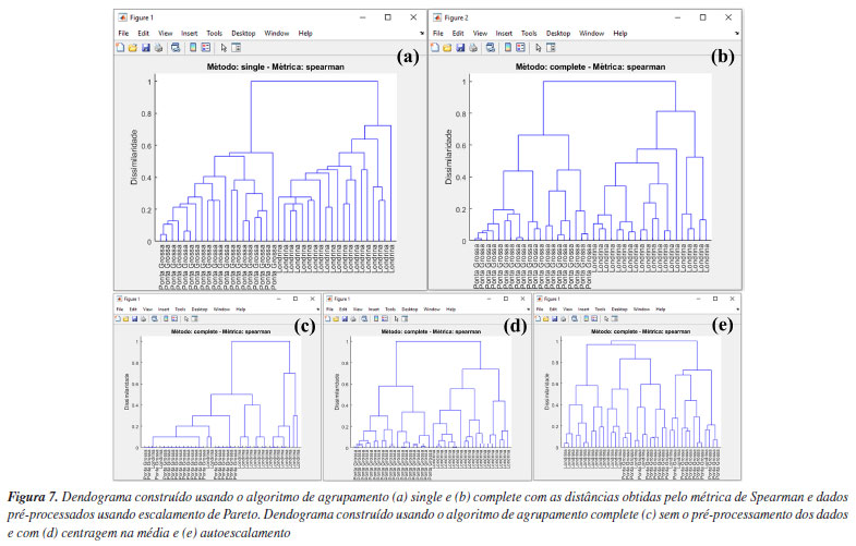 Por ser bem estabelecida há tempos, existe uma série de algoritmos disponíveis para a HCA.3 Portanto, uma forma de estimar a semelhança entre amostras é através do cálculo da distância entre elas. Usando a caixa "Métrica de distância", os usuários têm à disposição uma série de alternativas para estimar as distâncias entre pares de amostras (Figura 6b). Não existe uma regra geral para a escolha da distância que deve ser utilizada na HCA, e cada opção deve ser avaliada individualmente. Portanto, cabe aos usuários avaliarem separadamente as características de seus dados e tomar decisões sobre a métrica de distância que melhor se adequa aos objetivos da análise. Entre todas as possibilidades de métricas, a distância "euclidiana", "cityblock" (Manhattan) e "mahalanobis" são as mais populares entre os químicos. Para mais detalhes, consultar Ferreira.3 Entretanto, neste exemplo, após testar diferentes métricas, chegamos à conclusão de que a opção "spearman" produziu resultados mais adequados. Apesar de ser pouco comum, o coeficiente de correlação de Spearman (ρ) pode ser utilizado como métrica de distância na HCA.1 O coeficiente de correlação de Spearman (ρ) pode ser transformado em uma medida de dissimilaridade (distância) definida como: DSpearman(x, y) = 1 - ρ(x, y), onde DSpearman é a medida de dissimilaridade usada na HCA. Após definir a métrica para a estimativa das distâncias entre os pares de amostras, é hora de definir o método de agrupamento das amostras usando uma das opções na caixa "Método de agrupamento". No GAMMA-GUI, há uma série de alternativas de agrupamento disponíveis (Figura 6c), sendo os mais frequentes para os químicos o algoritmo do vizinho mais próximo "single", mais distante "complete", pela média "median", centroide "centroid" e de Ward "ward".3 A escolha do algoritmo de agrupamento depende da estrutura do conjunto de dados. Se os grupos estão bem discriminados, qualquer opção pode ser utilizada. Entretanto, se há uma sobreposição entre ou grupos ou alta proximidade entre eles, é preferível que usuários comparem os resultados entre os algoritmos do vizinho mais próximo (single) e mais distante (complete). Se os resultados forem iguais, isso sugere que as amostras estão naturalmente organizadas em grupos distintos.3 Neste caso, a comparação dos resultados entre os algoritmo single e complete, expressos nas Figuras 7a e 7b, revela que as amostras estão naturalmente organizadas em dois conjuntos distintos, uma vez que as amostras de Londrina e Ponta Grossa podem ser facilmente distinguíveis em ambos os casos, de acordo com um índice de dissimilaridade próximo a 0,8 (salto considerável na distância em relação à etapa anterior). Caso esse comportamento não fosse evidenciado, outra opção de análise de dados, como a PCA deve ser considerada.3 Nos dendrogramas da Figura 7, os índices de dissimilaridade (eixo das ordenadas) estão expressos em distâncias normalizadas. Para isso, basta os usuários marcarem a caixa "Normalizar as distâncias".