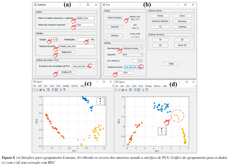 Por ser versátil, com várias possibilidades de combinações entre estimativas de métricas de distâncias e algoritmos de agrupamento, uma maneira eficaz de avaliar os resultados da HCA é através dos dendrogramas. Na Figura 7, temos os dendrogramas, uma representação gráfica na forma de um diagrama de árvore que exibe os agrupamentos (clustering) formados em cada passo e em seus níveis de similaridade. Cada nó no dendrograma representa um cluster ou um ponto de dados individual, e os ramos conectam os nós de acordo com a proximidade dos elementos, sendo que o tamanho dos ramos fornece o grau de dissimilaridade entre os grupos.54 Outro fator que deve ser considerado na análise dos dados é a aplicação do pré-processamento, conforme abordado na seção PCA. Na opção "Pré-processamento", os usuários podem testar diferentes possibilidades de pré-processamentos (Figura 6d). Neste caso, a comparação dos resultados entre os pré-processamentos de dados pode ser visualizada nas Figuras 7b-7e. Fica evidente nestes gráficos a importância da escolha do pré-processamento adequado, de modo que os resultados de agrupamento foram equivalentes usando Pareto (Figura 7b) ou centragem na média (Figura 7d), enquanto a ausência de pré-processamento (Figura 7c) ou a aplicação de autoescalamento (Figura 7e) pioraram os desempenhos, visto que amostras de Londrina foram agrupadas no grupo de Ponta Grossa e vice-versa. k-Means Nesta demonstração, vamos agrupar amostras de leites comerciais de acordo com o teor de gordura, utilizando dados espectrais adquiridos em um espectrômetro NIR portátil. Utilizaremos uma fração do conjunto de dados relatado no trabalho de Galvan et al.,56 que consiste em 80 amostras de leite, das quais 28 são amostras de leite integral (LI), 23 de leite desnatado (LD) e 29 de leite semidesnatado (LSD). A matriz X é composta por I linhas, que compreendem às amostras de leites, e J colunas, que correspondem aos comprimentos de onda em nanômetros, gerando uma matriz de dimensões 80 × 228, disponível no material de demonstração "dados_leite" e no YouTube.57 Desta vez, iniciaremos nossa demonstração utilizando a interface "Visualização e pré-tratamentos" (Figura 1Sa) para plotar o gráfico dos espectros e realizar o pré-tratamento dos dados. Nesta interface, aperte o botão "Plotar dados" e siga as instruções de preenchimento mostrados na Figura 5Sa (Material Suplementar). Durante a plotagem dos dados, os usuários têm a flexibilidade de criar suas próprias opções de rotulagem dos dados, entre outras opções, como excluir amostras do gráfico ou plotar classes específicas. Na Figura 5Sb, temos o gráfico dos espectros brutos das amostras. A análise visual dos espectros fornece informações importantes sobre como prosseguir no pré-processamento dos dados. Neste caso, é notável um deslocamento na linha de base nas ordenadas do espectro, possivelmente causado por efeitos de espalhamento aditivo e multiplicativo na absorbância, fenômenos característicos em espectros NIR. Observa-se ainda que, a partir de 1650 nm, ocorre um comportamento atípico no espectro, com aumento do ruído que se sobrepõe aos sinais dos espectros, e um ruído discreto entre 1400 e 1500 nm. Esses ruídos, resultantes da menor sensibilidade do detector ou da baixa intensidade da radiação em comprimentos de onda mais elevados, podem comprometer a análise dos dados. Em espectroscopia NIR, os pré-processamentos mais frequentemente aplicados incluem o uso de derivadas para a correção de efeitos aditivos, além de algoritmos como MSC ou SNV para corrigir efeitos multiplicativos e aditivos na absorbância. Além disso, algoritmos de alisamento, como a média móvel ou o filtro de Savitzky-Golay, são comumente empregados para reduzir o ruído nos espectros. É recomendável que os usuários testem diferentes opções de pré-processamento disponíveis no aplicativo. Para mais detalhes sobre os pré-processamentos, os leitores podem consultar Ferreira.3 Neste exemplo, após alguns testes, verificamos que cortar os espectros entre 900 e 1650 nm e aplicar o MSC foi suficiente para o agrupamento eficiente das amostras. Embora fosse possível aplicar também a primeira derivada com alisamento de Savitzky-Golay para corrigir efeitos de linha de base e ruído, os resultados obtidos foram similares, e por isso optamos por não incluir essa etapa extra. Para cortar os espectros, os usuários devem clicar no botão "Selecionar variáveis" e, em seguida, definir a matriz de dados (correspondente aos espectros brutos), o vetor de intensidades (relacionado aos comprimentos de onda) e, por fim, especificar a faixa desejada no campo apropriado, conforme indicado no aplicativo. Após cortar os espectros, a estrutura "sel_out" aparecerá no workspace do Matlab. Acessando essa estrutura, o usuário encontrará a matriz X com os espectros cortados, chamada "dados", e um vetor "faixa", que representa os comprimentos de onda dos espectros entre 900 e 1650 nm. Esses dados podem ser extraídos da estrutura (opcional). Para isso, basta clicar na matriz "dados", acessar a aba superior "VARIABLE" do software e, em seguida, clicar no botão "New from Selection" (ícone "+" amarelo no canto superior esquerdo), repetindo o mesmo procedimento para o vetor "faixa". Optamos por renomear a matriz "dados" para "dados_brutos" e o vetor "faixa" para "comp_onda", substituindo-os pelos dados cortados. Caso o usuário prefira não substituir os originais, basta atribuir novos nomes às variáveis. Ou, na linha de comando da "Command Window" (>>), o usuário pode escrever dados_brutos = sel_out.dados e comp_onda = sel_out.faixa. Em seguida, aplicaremos o algoritmo MSC na matriz de dados X cotada, ou seja, contendo a faixa espectral entre 900 e 1650 nm. Para isso, basta apertar o botão "Correção de sinal" e seguir as instruções de preenchimento da Figura 5Sc. Comparando os espectros das Figuras 