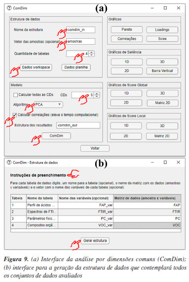 Antes da segmentação dos dados na caixa "Variável de saída", optamos por redefinir o nome da estrutura de saída dos resultados para "kmeans_out_msc", pois, adiante, iremos comparar os resultados com e sem a correção MSC. Essa comparação tem apenas o objetivo demonstrativo, para destacar a importância da etapa de pré-processamento antes da análise dos dados. É importante deixar claro aos leitores que não é adequado realizar a análise dos dados sem a execução prévia das etapas de pré-tratamento. Após essas etapas, apertar o botão "Segmentar" e, em poucos segundos, a análise será finalizada, gerando a estrutura "kmeans_out_msc" no workspace do Matlab. Na estrutura recém-criada, os usuários têm acesso aos resultados de agrupamento das amostras em "grupos", entre outros resultados da análise. Na estrutura "grupos", há três subestruturas que correspondem aos três grupos previamente estabelecidos. Ao acessar cada uma das subestruturas, os usuários podem verificar quais tipos de amostras foram agrupadas neste respectivo grupo. Neste caso, é possível observar que cada grupo contém somente amostras LSD, LD e LI. Uma opção gráfica dos resultados do k-means é a "projeção" dos agrupamentos nos escores das amostras obtidos com PCA. Para isso, é necessário realizar uma PCA para o mesmo conjunto de dados, conforme ilustrado na Figura 8b. Após a realização da PCA, retorne para a interface do k-means e, na caixa "Estrutura com resultados da PCA", o usuário precisa digitar o nome da estrutura de saída da PCA, neste caso "pca_out_msc", e então apertar o botão "Gráfico 2D". Na opção de gráfico 2D, o usuário pode escolher quais PCs deseja plotar, sendo que, neste caso, escolhemos a PC1 vs. PC2, ver Figura 8c. Para fins comparativos, realizamos o mesmo procedimento descrito anteriormente, mas desta vez, utilizando o conjunto de dados sem correção com MSC "dados_brutos", e obtivemos a Figura 8d. Ao projetar os resultados do agrupamento k-means nos escores da PC1 vs. PC2 gerados pela PCA, é notável a importância do pré-processamento aplicado, neste caso, a correção por MSC (Figuras 8c e 8d). Com a correção MSC, os leites semidesnatado (azul), desnatado (vermelho) e integral (amarelo) formam três agrupamentos distintos e bem definidos. Em contraste, ao utilizar os dados sem a correção MSC (Figura 8d), quatro amostras de leite semidesnatado (marcadas em amarelo no gráfico) foram erroneamente agrupadas no cluster das amostras de leite integral (azul). ComDim Nesta demonstração, exploraremos a estabilidade oxidativa da oleína de palma refinada e do óleo de soja parcialmente hidrogenado, submetidos ao processo de fritura industrial de produtos cárneos de frango usando a análise multibloco/multitabela.58 O conjunto de dados fornecido, denominado "dados_oleos", abrange quatro matrizes distintas, conforme vídeo no YouTube.59 A primeira matriz, compreende o perfil de ácidos graxos e índice de iodo, determinados por GC-FID (do inglês, gas chromatography-flame ionization detector), em 20 amostras de óleos, gerando uma matriz de dimensões 20 × 18, denominada "FAP". A segunda matriz, é composta pelos dados de fingerprint obtidos por FTIR-ATR (do inglês, Fourier transform infrared spectroscopy-attenuated total reflectance), gerando uma matriz de dimensões 20 × 2479, denominada "FTIR". A terceira matriz engloba a determinação de 6 parâmetros físico-químicos, resultando em uma matriz de dimensões 20 × 6, denominada "PC". Por fim, a quarta matriz incorpora dados da determinação de compostos orgânicos voláteis formados, analisados por SPME (do inglês, solid phase microextraction) e GC-FID, resultando em uma matriz 20 × 8, denominada "VOC". No vetor "amostras", os usuários têm acesso à identificação das amostras. As amostras iniciadas com a letra "P" representam a oleína de palma, enquanto as iniciadas em "S" correspondem ao óleo de soja. A segunda letra identifica os dois produtos cárneos de frango, sendo "A" e "B" submetidos à fritura. Além disso, as letras "T1" e "T2" representam o tanque de armazenamento antes e após a fritura, respectivamente. Já as amostras identificadas como "DF1", "DF2" e "DF3" referem-se ao tanque da fritadeira após 1, 2 e 3 h do processo de fritura. Mais detalhes podem ser encontrados em Silva et al.58 O ComDim é uma análise multibloco exploratória de dados, desenvolvido para extrair informações comuns de dados gerados a partir de diferentes fontes, ou seja, conjuntos de dados diferentes adquiridos para as mesmas amostras. Nesse sentido, o emprego do ComDim fundamenta-se na condição de que as matrizes de dados tenham apenas o mesmo número de linhas, não sendo obrigatório que tenham o mesmo número de colunas. Além disso, é fundamental observar que as amostras devem estar dispostas na mesma ordem em todas as matrizes de dados avaliadas.33,34,38 A principal vantagem do ComDim, comparada à PCA, reside na sua capacidade de realizar a extração de características relevantes de cada fonte de dados simultaneamente em uma única etapa, graças à sua natureza multibloco. Isso elimina a necessidade de conduzir diversas análises PCA separadas, simplificando e melhorando consideravelmente a interpretação dos dados. Além disso, a análise das saliências permite avaliar se os dados de diferentes fontes apresentam informações comuns ou complementares, e qual o peso de cada tabela nas dimensões comuns geradas. Na janela "Análise Exploratória" do GAMMA-GUI, os usuários precisam apertar o botão "ComDim", e uma janela semelhante a Figura 9a se abrirá. Uma etapa fundamental que antecede a análise dos dados consiste na geração da estrutura que contém cada conjunto de dados, que tem como default a nomenclatura "comdim_in". Iniciamos a construção da estrutura definindo alguns inputs fundamentais, como a definição opcional do vetor que contém o nome das amostras, digitando "amostr
