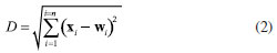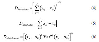 A decomposição dessa matriz ![]() A matriz de escores T contêm as coordenadas de cada amostra em relação aos eixos das PCs, enquanto a matriz de pesos L contém a informação de quanto cada variável original contribuiu na formação de cada PC.3 O processo de decomposição da matriz pode ser realizado de diferentes formas, sendo a decomposição por valores singulares (singular value decomposition, SVD) a mais frequente devido à sua melhor performance para grandes conjuntos de dados com muitas variáveis. Entretanto, outra abordagem comum para calcular as matrizes de escores e de pesos é através do algoritmo NIPALS (nonlinear iterative partial least squares). Mais detalhes a respeito da decomposição SVD e NIPALS é dada por Ferreira.3 Uma descrição mais abrangente e clássica da PCA é apresentada por Bro e Smilde,25 enquanto Rodionova et al.26 discutem as novas ferramentas e tendências recentemente associadas ao modelo PCA. Mapas auto-organizáveis (SOM) O SOM é modelo de aprendizagem não linear para análise exploratória de dados complementar à PCA, introduzido por Teuvo Kohonen na década de 1980.27 Quando o uso de modelos quimiométricos lineares, como a PCA, não for muito informativo devido a uma estrutura de dados complexa, abordagens não lineares podem permitir uma melhor compreensão dos dados.1 Como o nome sugere, no SOM os dados são organizados de modo não supervisionado em um "mapa" tipicamente bidimensional, semelhante, ao gráfico de escores da PCA. O SOM é considerado uma rede neural competitiva do tipo feed-forward de camada única, inspirada no cérebro humano, e seu fundamento consiste em nós de entrada e uma grade de nós computacionais conectados (neurônios) que competem entre si para serem "ativados". Durante o treinamento da rede neural, o neurônio i com a menor distância Euclidiana D (Equação 2) entre o vetor de entrada x e o vetor de pesos do neurônio w é chamado de "neurônio vencedor" ou best matching unit (BMU).1,6,27,28 ![]() Durante a etapa de cooperação os vetores modelos nas proximidades do BMU vão cooperar para formar uma região do SOM especializada em padrões similares ao da amostra x. Em seguida, ocorre o processo de atualização dos pesos dos neurônios vizinhos ao BMU seguindo o postulado de aprendizagem de Hebb (Equação 3). ![]() Sendo que wn representa o novo vetor de pesos do neurônio, wo o vetor de pesos do neurônio antes da atualização, η a taxa de aprendizado e h a função de vizinhança. O processo é repetido várias vezes até que os neurônios estejam organizados em um mapa topológico, onde neurônios próximos representam dados similares.1,6,27,28 Análise de agrupamentos hierárquicos (HCA) A HCA é um modelo quimiométrico não supervisionado de agrupamento "suave" (soft clustering), pois os objetos podem pertencer a múltiplos clusters em diferentes níveis de hierarquia, útil para redução da dimensionalidade de grandes conjuntos de dados. Inicialmente, ocorre um particionamento dos objetos em k = 1,..., n clusters, que posteriormente são ordenadas hierarquicamente pelo modo aglomerativo ou divisivo. A opção aglomerativa é a adotada no aplicativo, por meio da função "linkage" do Matlab.29 Nessa abordagem, o primeiro passo consiste em considerar cada objeto como um grupo unitário/único, e então, segue agrupando sistematicamente os grupos por ordem de similaridade. No caso da abordagem divisiva, inicia-se por grupos que vão se dividindo em subgrupos por dissimilaridade.3 Os clusters são formados entre amostras que tenham comportamento semelhante, cuja fundamentação consiste em maximizar a homogeneidade intragrupo e maximizar a heterogeneidade intergrupo. Uma maneira de determinar semelhanças entre as amostras, é feito através do conceito de métricas de distância entres eles, que podem ser obtidas de diferentes formas.1,3 No espaço multivariado RJ, a distância estimada entre dois objetos definidos pelos vetores xA (com componentes/variáveis xA1, xA2,..., xAj) e xB (com componentes/variáveis xB1, xB2,..., xBj) mais populares entre os químicos é a Euclidiana, Manhattan (cityblock) e Mahalanobis (Equações 4, 5 e 6), onde Var-1, é a inversa de matriz de variância-covariância que explica a dispersão dos dados ao redor do centroide. Para mais detalhes consultar Ferreira.3,30 ![]() Existem ainda outras métricas de distância, entre elas, destacam-se a distância Euclidiana ao quadrado, Minkowski, Chebyshev, cosseno (cosine), correlação (correlation), Spearman, Hamming e Jaccard. Maiores detalhes sobre essas estimativas podem ser encontrados em Varmuza e Filzmoser 1 e ajuda do Matlab.31 A etapa seguinte consiste no "linkage", que calcula a distância entre os grupos de amostras durante a construção do dendrograma, que são obtidos utilizando índices de similaridade, que permitem identificar grupos de objetos com base em diferentes níveis de similaridade, onde o comprimento dos ramos reflete diretamente o grau de similaridade entre os grupos. Então, a distância entre dois clusters com índice l e m pode ser determinada de várias maneiras, sendo os mais utilizados o algoritmo do vizinho mais próximo (single), mais distante (complete), pela média (average), centroide e de Ward.1,3 Entretanto, outros algoritmos para calcular distância entre clusters pela mediana (median) e distância média ponderada (weighted) também podem ser utilizadas.29 O single forma agrupamentos esparsos, usando a menor distância entre elementos, sendo robusto a outliers. O complete, é baseado na maior distância, e produz clusters compactos, mas é sensível a outliers. O average equilibra ambos, calculando a média das distâncias, enquanto o weighted faz o mesmo, mas atribui pesos iguais aos clusters, independentemente do tamanho. O median usa a mediana das distâncias, sendo mais robusto que o centróide. Já o método do centróide agrupa clusters pela proximidade de seus centrói