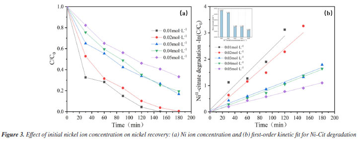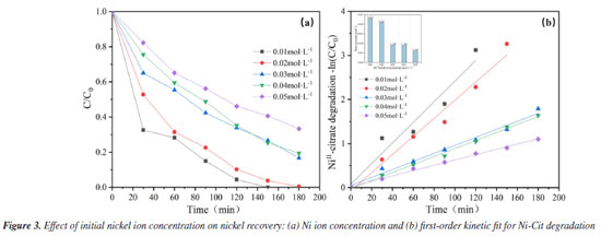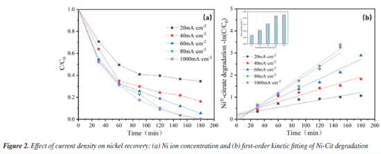 This study also focuses on evaluating the cost of nickel recovery to determine the economic advantages of the system in terms of energy consumption and benefits, depending on market pricing estimates, as shown in Table 1S. The calculation results of energy consumption and economic benefits for nickel recycling have been listed in "Energy consumption and economic benefits of nickel recycling" sub-section presented in the Supplementary Material. A reasonable current density, preferably 80 mA cm-2, was chosen depending on the actual scenario to reduce the overall energy consumption of the process and completely extend the electrode life. Effect of initial Ni ion concentration The EOSE system for Ni-Cit was tested by comparing the recovery of Ni2+. Figure 3a shows the effect of initial NiII-citrate concentration (ranging from 0.01 to 0.05 mol L-1) on the extent of Ni2+ recovery. After 180 min of electrolysis, Ni2+ recoveries were 100, 99.6, 84.5, 81.8, and 69.6%, respectively. As the initial concentration increased, the high concentration of nickel citrate consumed a large number of hydroxyl radicals, resulting in a decrease in anodic complex-breaking efficiency and an indirect effect on cathodic Ni2+ recovery. Longer electrolysis times and higher current efficiencies are required to achieve complete removal, especially at elevated NiII-citrate concentrations.2 As shown in Figure 3b, the pseudo-first-order rate constant (k) significantly decreases as the initial Ni2+ concentration increases from 0.01 to 0.05 mol L-1. The highest rate constant (k = 0.023 min-1) was observed at an initial Ni2+ concentration of 0.01 mol L-1. This value is nearly four times higher than that at 0.05 mol L-1 (0.006 min-1). This is consistent with our previous hypothesis. Furthermore, in terms of the direct electrochemical oxidation mechanism on the anode surface, the higher concentrations of nickel citrate limited the charge transfer at the fixed electrode surface, and the anode was unable to catalyze the oxidation effectively, preventing nickel citrate removal.26