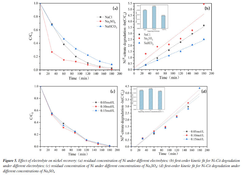Effect of electrolyte type The electrochemical oxidation process depends a lot on the kind of electrolyte. Some electrolytes release active chemicals that aid in the elimination of pollutants, while others quench free radicals in water and prevent pollutant degradation.29 To evaluate the effect of electrolyte composition on the ability of the EOSE system to treat Ni-Cit, different sodium salts (Na2SO4, NaCl, and NaHCO3) were used as supporting electrolytes (100 mmol L-1 each), and the recovery of nickel metal was compared after 180 min of reaction. As indicated in Figure 5a, the recovery of nickel metal is Na2SO4 > NaCl > NaHCO3. The maximum nickel recovery (99.6%) was achieved using Na2SO4 as the supporting electrolyte. First-order dynamics with a pseudo-first-order rate constant (k) provide additional description. As demonstrated in Figure 5b, the maximum value of k (0.024 min-1) is attained when the supporting electrolyte is Na2SO4, while the minimum value of k (0.014 min-1) is attained when the electrolyte is NaHCO3, the difference between the two is enormous. The explanation for this is most likely because when the electrolyte is NaHCO3, the pH of the aqueous solution is high. Under alkaline conditions, more OH- ions are adsorbed on the anode surface, occupying electroactive sites and undergoing oxidation to O2. This competes with the availability of the active site and reduces the capacity of the EOSE system to degrade nickel citrate. Furthermore, the influence of conductivity on the recovery of nickel ions was examined using varied concentrations of Na2SO4 as the supporting electrolyte. In Figure 5c, the recoveries of Ni2+ after 180 min of electrolysis were 97.4, 99.6, and 96.6% with 50, 100, and 150 mmol L-1 Na2SO4 as supporting electrolytes, respectively. According to the first-order dynamics with a pseudo-first-order rate constant (k), as shown in Figure 5d, the values of k at three different Na2SO4 electrolyte concentrations are 0.023, 0.025, and 0.022 min-1. The concentration of the electrolyte has little effect on the ability of the EOSE system to process nickel citrate. This may be because sulfates consume OH to form SO4-, making it unable to increase the active material by raising its concentration, thereby improving nickel recovery. However, high concentrations of sulfate may cause surface adsorption blockage on the anode, exerting only a minor influence on the on the electrocatalytic performance of the electrode.