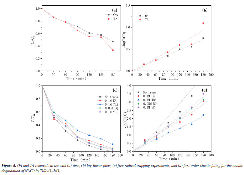 Under sulfate electrolyte conditions, the important active species generated during electrolysis are primarily SO4− and S2O82−. Sulfate (SO42-) acts as an active electrolyte in this process.30 The description of this variation is show in Figure 2S (Supplementary Material). The anode surface of SO42− can undergo direct oxidation to S2O82- (Equation 1) and further activation by radicals or non-radicals to SO4− (Equation 2).31 SO42- may also be oxidized directly to SO4− by an electron transfer reaction (Equation 3). At the same time, the reactive radicals (OH) generated by indirect oxidation at the anode can also contribute to the conversion of SO4− (Equations 4-6).32 ![]() Identification of the Ni-Cit degradation pathway Electrochemical oxidation of Ni-Cit According to earlier research,33 direct electron transfer (DET) and OH-mediated mechanisms can cause the anodic oxidation of target contaminants. Since they react with OH at distinct rate constants (1.4 × 106 M−1 s−1 and 4 × 109 M−1 s−1), OA and TA were chosen as probes for direct electron transfer and OH-mediated reactions, respectively, in light of the possibility that both mechanisms could degrade nickel citrate.22 Figures 6a and 6b show log-linear plots of OA and TA as a function of time, along with the corresponding first-order rate constants for their removal in the Ti/RuO2-IrO2 anode system. The highest removal rates of the two compounds on the Ti/RuO2-IrO2 electrode were 0.004 and 0.005 min-1, respectively. It is demonstrated that DET and OH-mediated processes occur simultaneously in the electrochemical system with Ti/RuO2-IrO2 as the anode. Based on the TA removal data, the steady-state OH concentration was found to be 1.25 × 10-12 M.