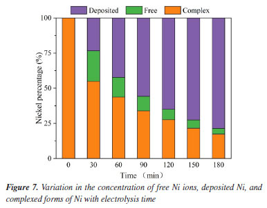 To determine the role of OH in the breakdown of nickel citrate by Ti/RuO2-IrO2, free radical scavenging tests were conducted to rule out the presence of additional active chemicals. The addition of appropriate amounts of tert-butanol (TBA), ethyl alcohol (EA), ascorbic acid (VC), and 1,4-p-benzoquinone (BQ) trapped hydroxyl radicals, holes, electrons, and superoxide radicals, respectively. Figure 6c shows the change in nickel ions in solution after 180 min of reaction with different trapping agents. It is clear that the addition of tert-butanol has the largest inhibitory effect; nickel recovery with other capture agent additions was nearly comparable to that without the capture agent. The reaction system consists of OH as the major active species and holes as secondary active species. According to the first-order dynamics with a pseudo-first-order rate constant (k), as shown in Figure 6d, the highest value of k (0.027 min-1) was obtained without the addition of the capture agent, while the lowest value (0.011 min-1) was obtained with the addition of tert-butanol as the capture agent. The electrochemical breakdown of nickel citrate using Ti/RuO2-IrO2 as an anode highlights the significance of OH. Degradation pathway and degradation mechanism of Ni-citrate The citric acid complex is transformed into numerous intermediates during the electrocatalytic oxidative degradation of Ni-Cit. To discover these intermediates, the electrocatalytic oxidative degradation of nickel citrate was studied. The intermediate products in the electrocatalytic oxidative degradation of Ni-Cit were analyzed using UHPLC-MS on samples collected after 30 and 120 min of electrolysis. The detected intermediates are listed in Table 2S and the possible degradation pathways of nickel citrate are proposed, as shown in Figure 3S (Supplementary Material). Citric acid shows a mass-to-charge ratio (m/z) of 193. All other m/z values arise from its stepwise degradation. One pathway involves hydroxyl radicals attacking the terminal C-COOH group to form 3-hydroxyglutaric acid. Further oxidation produces ketoglutaric acid34 and 3-oxobutyric acid. Acetone is then formed through the loss of the acetate group and is later oxidized to acetic acid. In another pathway, hydroxyl radicals target the terminal C-OH group. This initiates the progressive degradation of citric acid into aconitic, citraconic, mesaconic, itaconic, butenedioic, methacrylic, oxalic, and formic acids. The dominant mechanisms include demethylation and deacetylation reactions. Ultimately, all intermediate products are mineralized into CO2 and H2O. Cathodic nickel metal deposition and analysis of the mechanism The electrodeposition technique is primarily used on the cathodic surface of stainless steel, except for electrocatalytic oxidation of organically complexed ligands at the anode. This study looked at how the shape of nickel in Ni-Cit changed when treated in the EOSE system. Figure 7 shows the concentrations of free nickel ions, complexed nickel, and nickel deposited on the cathode. The free Ni2+ concentration was shown to initially increase during the first 30 min of electrolysis, then gradually decrease and reach zero after 3 h of continuous electrolysis.
