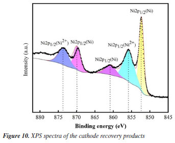 Finally, to understand the putative mechanism of nickel electrodeposition, cathodic deposition was studied using XPS, corrected by the C 1s peak (284.8 eV). Throughout the reaction, the Ni 2p spectra of the product recovered cathodically displayed five peaks, as can be seen in Figure 10. These peaks appeared at 852.30, 855.80, 860.89, 869.61, and 873.73 eV, respectively. The binding energy of Ni(OH)2 is responsible for the two primary peaks for Ni 2p3/2 at 855.80 and Ni 2p1/2 at 873.73, as well as their satellite peak at 860.89 eV.36 The zero-valent nickel peaks are located at 852.30 and 869.55 eV.26 According to the XPS data, the nickel ions in the solution precipitated at the cathode as nickel hydroxide and zero-valent nickel following the electrochemical oxidation of nickel citrate.