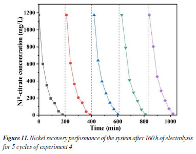 Furthermore, it was discovered that the pH of the solution has a direct impact on the type of nickel that is deposited at the cathode during the electrodeposition reaction. Zero-valent Ni made up the majority of the deposition products at the cathode at pH 3.0 (see Figure 4Sa, Supplementary Material), for pH values higher than 4.0, green Ni(OH)2 is generated (Figure 4Sb). In the meantime, the presence of Ni(OH)2 will hinder the ability of Ni(OH)ads to adsorb Ni ions and lower the recovery efficiency of Ni (Figure 10).2,39 As the reaction proceeds, Ni(OH)2 reacts to create black NiOOH. During the reaction, it was discovered that a single increase in current density did not improve nickel recovery (Figure 3). Instead, this speeds up the initiation of side reactions and the rate of hydrogen generation, resulting in wasted energy. The efficiency of the system is significantly impacted by the mass transfer coefficient and the conductivity of the solution in the electrochemical process. The efficiency of contaminant breakdown and nickel recovery is directly impacted by this phenomenon. The concentration of nickel ions is one of the main parameters influencing conductivity and the mass transfer coefficient.40 To achieve the best Ni recovery, the treatment of Ni-Cit complexation waste streams by the EOSE system must carefully take into account the effects of operational factors such as current density, pH, and initial Ni ion concentration. Electrode life test By checking the long-term deterioration in the performance of the Ti/RuO2-IrO2 anode, the stability of the electrodes was evaluated. First, a 160-h electrolysis was performed on the Ti/RuO2-IrO2 anode. By contrasting the nickel recoveries from the experiment's five cycles. After 160 h of electrolysis, the performance of the Ti/RuO2-IrO2 anode did not decrease, as can be seen in Figure 11, and after five experiment cycles, the nickel recovery was almost constant at 99%. As the anode in the EOSE system for the treatment of metal-organic complexes in the electroless nickel plating waste solution, the results showed the exceptional stability of Ti/RuO2-IrO2.