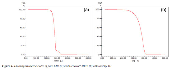 All solid dispersions studied were able to improve the solubility of CBZ. At a 1:9 ratio, the release of CBZ into its soluble form was the highest compared to the other ratios. Among these, the solid dispersion composed of Gelucire® 50/13 was the most effective, exhibiting 2.90 times higher solubility than pure CBZ, followed by 1.94 times when the carrier used was PEG 6000, 1.79 times for the 1:1 PEG 4000:PEG 6000 ratio, and 1.71 times for PEG 4000. These results indicate that Gelucire® 50/13 at this ratio provided better aqueous solubilization of CBZ than the other carriers. For comparison with the solid dispersion composed of Gelucire® 50/13, an assay was conducted using physical mixtures of CBZ and Gelucire® 50/13 at the same ratios (1:1, 1:5, and 1:9), where the results were similar for the 1:5 ratio. At the 1:9 ratio, the solid dispersion was more efficient than the physical mixture. One possible explanation for the superior performance of solid dispersions containing Gelucire® 50/13 compared to those prepared with polyethylene glycol (PEG) lies in the distinct physicochemical properties of these carriers. The Gelucire® carriers are an amphiphilic excipient composed of glycerides and polyethylene glycol esters of fatty acids, which enables it to form micelles in aqueous media, enhancing the apparent solubility of poorly water-soluble drugs through micellar solubilization. In addition, Gelucire® significantly improves the wetting of drug particles by reducing the interfacial tension, facilitating dispersion in the dissolution medium. Furthermore, its low melting point allows the formation of a uniform, porous matrix that improves water penetration and drug release.10 The solubilization of the drug can be influenced by specific types of chemical interactions that may depend on the structure of both the drug and the polymer. These specific interactions can easily occur with mono-, di-, and triglycerides, fatty alcohols, and polyglycosylated fatty acid esters, leading to an increase in solubility.11 Regarding the performance of solid dispersions at a 1:9 ratio (10% active ingredient), their efficiency is already well-documented in the literature and can be explained by several factors, such as the reduction in drug crystallinity due to an increase in the contact surface between the drug and the dispersing medium, consequently leading to greater dispersion of the drug in this medium. The drug particles may also be in a molecular form, or the manufacturing process itself may have promoted the formation of lower-melting-point polymorphs or an amorphous state in the solid dispersion.11 Techniques such as DSC, X-ray diffraction, electron microscopy, among others, are used for physicochemical characterization and can lead to a better understanding of possible drug-polymer interactions. Based on the solubility study results, the solid dispersion of CBZ in Gelucire® 50/13 at a 1:9 ratio was selected for further investigation. Initially, the CBZ:Gelucire® 50/13 solid dispersion samples were characterized through thermal analysis, powder X-ray diffraction, hot-stage microscopy (HSM), and infrared spectroscopy. Thermoanalytical studies Thermogravimetric analysis (TG) Thermogravimetric analysis was performed on CBZ and the polymeric carrier to determine the maximum temperatures at which these compounds remain stable, considering that during the melting process for the production of solid dispersions, the materials are subjected to thermal heating for a certain period. Figure 1a presents the thermogravimetric behavior of CBZ, showing the percentage of mass loss (%) during heating from 30 to 600 ºC at a constant rate of 10 ºC min-1. CBZ exhibited two decomposition stages. The first stage began at 252.91 ºC and ended at 286.59 ºC, with a mass loss of 90.29%. The second decomposition stage extended from 286.59 to 333.74 ºC, resulting in an additional mass loss of approximately 9%, leaving a final residual mass of 0.71%.