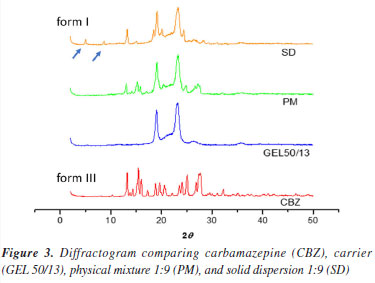 CONCLUSIONS The present study demonstrated that solid dispersions of carbamazepine prepared with Gelucire® 50/13 significantly improved the solubility and dissolution rate of the drug compared to dispersions prepared with polyethylene glycol (PEG). The superior performance of Gelucire® 50/13 can be attributed to its amphiphilic nature, which promotes micellar solubilization, enhances drug wetting, and facilitates partial amorphization, factors that contribute to increasing drug availability in aqueous media. Moreover, the fusion method used to prepare the dispersions favored the transformation of CBZ from the metastable form III to the more stable form I, and the presence of Gelucire® may have contributed to maintaining form I during storage and dissolution. These findings reinforce the potential of Gelucire®-based solid dispersions as an effective and simple strategy to enhance the biopharmaceutical performance of poorly water-soluble drugs such as CBZ. Future studies may explore the long-term stability and in vivo performance of these formulations to confirm their clinical applicability.