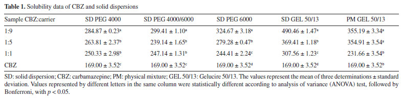 RESULTS AND DISCUSSION Water solubility tests The solubility of a drug is of utmost importance, as it directly influences the absorption rate of the active ingredient and the dose that should be administered. Poorly soluble drugs can become a limiting factor in dissolution. Therefore, strategies employed to increase the solubility of active ingredients are extremely important to ensure greater patient safety.9 Table 1 shows the solubility data of solid dispersions using the polymers evaluated in this study.