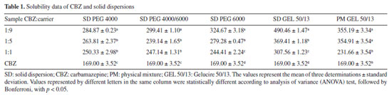 EXPERIMENTAL Preparation and characterization of solid dispersions Preparation of solid dispersions Gelucire® 50/13, PEG 4000, and PEG 6000 were used as carriers. Each polymer was heated to 10 ºC above its melting point using a heating plate. CBZ was then gradually added under gentle stirring in different proportions. The molten material was subsequently cooled for 60 min in a freezer (-18 ± 1 ºC). Each sample was pulverized using a mortar and pestle and then sieved to calibrate the particle size, ensuring that it did not exceed 300 µm (50-mesh sieve). Preparation of physical mixtures Physical mixtures of the solid dispersion produced with the polymer that provided the best solubility were prepared for comparison in physicochemical characterization assays. Gelucire® 50/13 was used to prepare the physical mixture in CBZ:carrier ratios of 1:9 (10% CBZ), 1:5 (16.7% CBZ), and 1:1 (50% CBZ). Each sample was manually homogenized in an appropriate container for 10 min, followed by sieving to calibrate the powder mixture, obtaining particles smaller than 300 µm. Solubility study of solid dispersions The solubility test was conducted at 37 ± 1 ºC in purified water under controlled magnetic stirring for 48 h in a temperature-controlled oven. The tested ratios were 1:9, 1:5, and 1:1 (CBZ:polymer). The evaluated polymers were PEG 4000, PEG 6000, a 1:1 PEG 4000/PEG 6000 mixture, and Gelucire® 50/13. The solid dispersions of these polymers were weighed and added to water at a concentration of 20 mg mL-1, followed by stirring under controlled temperature as described above. Subsequently, the samples containing PEG 4000 and PEG 6000 were filtered through a 0.45 µm Millipore membrane using a vacuum system. Solid dispersions composed of Gelucire® 50/13 were filtered using a 0.45 µm Millipore membrane with vacuum assistance, followed by a second filtration using 0.22 µm Millipore filters. These samples were diluted, and their absorbance was determined by high-performance liquid chromatography (HPLC). All analyses were performed in triplicate. In vitro dissolution studies The dissolution rates of CBZ and solid dispersions were determined using the paddle method (USP apparatus 2) at a stirring rate of 75 rpm and 37 ºC in a dissolution apparatus (NE 330-8, Nova Ética, Vargem Grande Paulista, Brazil). The dissolution medium was 900 mL of deionized water, and the samples contained 180 mg of solid dispersion (SD), corresponding to 18 mg of the drug. Aliquots (5 mL) were withdrawn at 0, 5, 10, 15, 30, and 60 min, filtered (0.22 µm), and their drug content was determined by HPLC at 340 nm. The samples were tested in sextuplicate. Quantitative determination of CBZ The quantitative determination of CBZ was performed using chromatographic analysis with a Shimadzu (Kyoto, Japan) liquid chromatography system equipped with an LC-10 AT VP solvent pump unit and an SPD-10AVP UV-visible detector operating at 340 nm. Samples were manually injected through a Rheodyne injector (20 µL loop). Separation was performed on a C18 Shim-pack CLC-ODS column (280 mm × 4.6 mm, 5 µm) with a pre-column C18 Shim-pack CLC-ODS (10 mm × 4.6 mm, 5 µm). The mobile phase consisted of acetonitrile:water (35:65, v/v) at a flow rate of 1 mL min-1. Data were collected using a Chromatopac C-R6A integrator (Shimadzu).8 The HPLC method employed for CBZ quantification was previously validated, considering parameters such as sensitivity, linearity (1-30 mg mL-1), accuracy (coefficient of variation of 2.45%), and precision (coefficient of variation of 3.67%). The calibration equation was y = 35926x + 9238.3, with a linear correlation coefficient of r = 0.9980. Physicochemical characterization Thermogravimetric analysis (TG) CBZ and Gelucire® 50/13 were subjected to thermogravimetric analysis using a DTG-60 (Shimadzu, Kyoto, Japan). A sample of 5.00 ± 0.01 mg of each material was placed in an alumina crucible and heated from 30 to 600 ºC at a rate of 10 ºC min-1 in a nitrogen atmosphere with a flow rate of 30 mL min-1. The obtained data were analyzed using TA60 software (Shimadzu). Differential scanning calorimetry (DSC) Physical mixtures and solid dispersions of CBZ/Gelucire® 50/13 at 1:9, 1:5, and 1:1 ratio were analyzed using differential scanning calorimetry (DSC) with a DSC 50 Shimadzu device. An amount of 4.00 ± 0.05 mg of each sample was weighed and sealed in an aluminum sample holder. The samples were heated from 30 to 300 ºC at a rate of 10 ºC min-1 under a nitrogen atmosphere flowing at 50 mL min-1. The obtained data were analyzed using TA60 software (Shimadzu). Hot-stage microscopy (HSM) study Physical mixture (1:9) and solid dispersion (1:9) samples of CBZ in Gelucire® 50/13 were analyzed using hot-stage microscopy (HSM). A Zeiss Axio Cam HRC microscope equipped with a Linkam TMS 93/THSG 600 heating plate system was used. A small amount of each sample was placed in a sample holder and heated from 30 to 200 ºC at a rate of 10ºC min-1. X-Ray powder diffraction study Physical mixture (1:9), solid dispersion (1:9), CBZ, and Gelucire® 50/13 samples were subjected to X-ray diffraction analysis. The equipment used was a D5005 Bruker-Siemens X-ray diffractometer, equipped with a sealed copper source (λ = 1.5418 Å), operating in the 2θ range of 2 to 50º at an angular speed of 0.02º s-1, with a voltage of 40 kV and a current of 30 mA. Infrared spectroscopy (IR) study Physical mixture (1:9), solid dispersion (1:9), CBZ, and Gelucire® 50/13 samples were analyzed using infrared spectroscopy with an FTIR Nicolet Protege 450 device. The samples were mixed with potassium bromide (KBr) in a quartz mortar and pressed into mini-pellets to obtain translucent discs. Spectra were obtained in the wavenumber range of 4000-400 cm-1, and the characteristic peaks were analyzed.