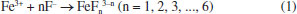These results contrast with some previous works5,21,22 that claim that doping with Fe3+ ions does not affect the inner diameter of TiO2 nanotubes nor the thickness of the anodic film. However, it is in agreement with what was observed in another study,4 where the introduction of iron ions into the electrolyte caused a slight reduction in the dimensions of the nanotubes and the anodic film. The addition of iron to the electrolyte directly interferes with the morphology of the anodic film, causing a decrease in the diameter of the nanotubes and a reduction in the thickness of the anodic film. An increase in the iron concentration prevents the formation of nanotubular structures and promotes the degradation of the anodic film.23 A possible explanation for this phenomenon is that the Fe3+ available in the reaction medium binds to the fluoride ions, reducing their availability and slowing down the growth of the nanotubes. This is because the growth of the nanotubes occurs in three stages: field-assisted oxidation, field-assisted dissolution, and chemical dissolution. This last stage is directly linked to the concentration of F- ions. When Fe3+ is added to the working electrolyte, the iron can react with the fluoride ions:24