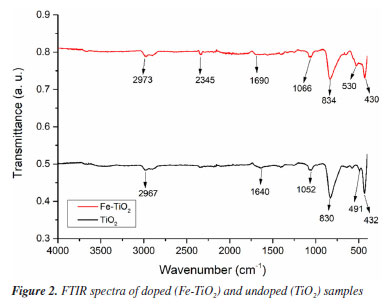 The spectra obtained in the FTIR tests for the doped and undoped samples are shown in Figure 2. The FTIR spectra showed similar profiles for the TiO2 and Fe-TiO2 samples. All samples exhibited peaks in the range between 2960-2980 cm-1, which can be attributed to the narrowing of the C-H bond, indicating the presence of electrolyte residues.19 The same explanation can be given for the peak observed in the doped sample at 2345 cm-1, which corresponds to the C=O stretching.5 The peaks obtained at 1690 cm-1 for Fe-TiO2 and 1640 cm-1 for TiO2 are due to the H-O-H bond of water adsorbed on the surface of the nanotubes.5,20 The peaks in the range of 1050-1070 cm-1 correspond to the anatase phase of TiO2.19 In the doped sample, a prominent peak was observed at 834 cm-1, this may be indicative of the presence of iron in the sample since bands present in the range of 700-930 cm-1 can be attributed to the Fe-O-Ti bond.5 However, a peak of equal magnitude was also observed in the same region for the undoped sample. Some studies19,20 in the literature state that the peaks present in broad ranges such as 550-800 cm-1 and 400-900 cm-1 correspond to the Ti-O-Ti and O-Ti-O bonds. Therefore, the results indicate that there may have been an overlap of peaks in the samples, preventing the identification of certain bonds. Thus, additional characterization is necessary to explain the differences between pure TiO2 and Fe3+-doped TiO2 nanotubes.