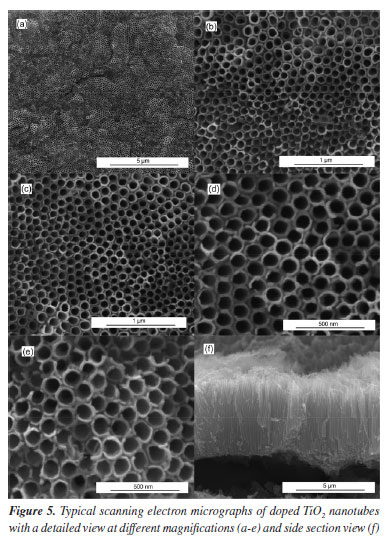 CONCLUSIONS It is possible to obtain TiO2 and Fe-TiO2 nanotubes through electrochemical anodization without and with in situ doping using a potential of 48 V and an anodization time of 120 min. The addition of iron ions in the working electrolyte promotes a slight reduction in the current during the anodization process. Fourier transform infrared spectroscopy analyses were not sufficient to prove the presence of iron in the doped TiO2 nanotubes. The same can be said for X-ray diffraction. However, the presence of iron in the doped samples was observed by energy dispersive spectroscopy, which showed a content of 1.69 at.%. X-ray diffractograms indicate that TiO2 and Fe-TiO2 nanotubes have the anatase phase. At the nanoscale, this phase has greater stability and favors photocatalytic processes. Iron doping alters some morphological attributes of TiO2 nanotubes. It was observed that the internal diameter of the nanotubes and the thickness of the anodic film are smaller in the Fe-TiO2 samples, however, doping did not alter the thickness of the nanotube wall. The influence of iron doping on morphology can be attributed to the low availability of F- ions in the reaction medium. This may occur because the ionic iron present in the electrolyte binds to the fluoride-generating FeFn3-n. Doping did not cause variations in the band gaps of the samples, since the average values found are statistically equal: 2.962 ± 0.107 eV for the Fe-TiO2 and 3.057 ± 0.049 eV for the TiO2. The photoelectrochemical performance of Fe-TiO2 was slightly superior to that of TiO2. However, the results may not reflect the real photocatalytic capacity of the samples, since the band gaps were found to indicate that they are photoactive only in the UV region, and the photocatalytic measurements were performed mainly in the visible region.