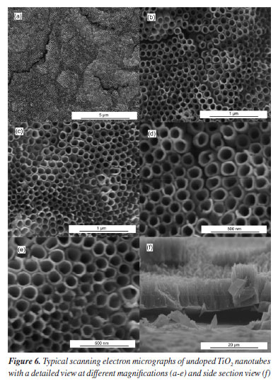 No reflections related to iron-containing phases were identified in the Fe-TiO2 sample. This can be explained in two ways: the iron concentration in the doped sample was below the detection level of the diffractometer and/or the iron ions were incorporated into the TiO2 crystal structure, making it impossible to form a secondary iron phase that could be detected.4,5 Morphological analysis indicated that there were some differences between the doped and undoped samples. Typical micrographs are presented in Figures 5 and 6. The existence of TiO2 nanotubular structures can be seen in both figures. The parameters evaluated were the thickness of the anodic film, the internal diameter of the nanotubes, and the wall thickness. Table 2 presents the relationship between the average dimensions of each parameter obtained in the samples doped with Fe3+ ions and undoped samples.