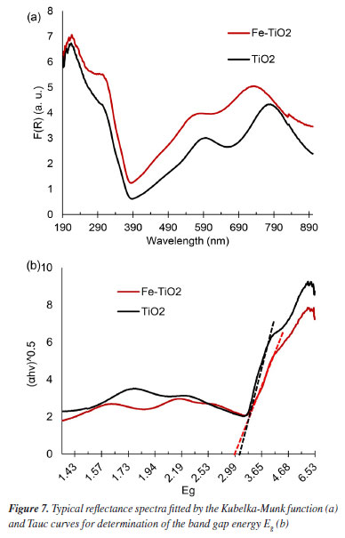 The current densities found were approximately 3.95 µA cm-2 for Fe-TiO2 and 3.60 µA cm-2 for TiO2. One of the justifications for this is that the measurements of the photoelectrochemical tests in this work were performed only in the visible light range. The influence of the wavelength used on the resulting photoresponse is observed in other works in the literature.29,30 In some studies, chronoamperometry tests performed with a filter that simulates the entire solar spectrum had a photocurrent of 54 µA cm-2, whereas when the test was performed only under visible radiation, the photocurrent was approximately 3 µA cm-2.30
