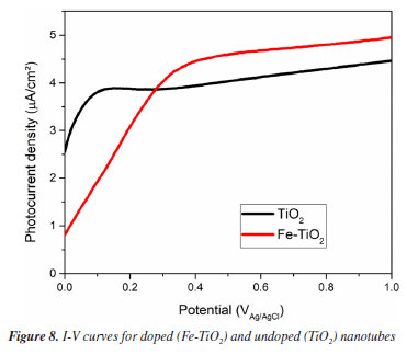 The average Eg found for the Fe-TiO2 and TiO2 samples were 2.962 ± 0.107 eV and 3.057 ± 0.049 eV, respectively. The p-value, obtained through the t-test, was 0.402 (i.e., > 0.05), therefore, it can be concluded that the averages are statistically equal. Thus, based on the Eg determinations, it cannot be stated that doping had any effect on the band gap. The Eg values obtained in both conditions are around 3.0 eV, this indicates that both samples are more photoactive in the UV region, having a maximum absorption length (λmax) of around 400 nm.25 The average Eg resembles reports from other research.4,26 There are studies in which it was verified that for anodization carried out at 40 V, the band gaps of the doped (3.05 eV) and undoped (3.0 eV) samples were practically the same.4 One explanation for this is that high anodization potentials are capable of creating oxygen vacancies that hide the effect of doping.4,8 It is known that oxygen vacancies can form both on the surface and inside the oxide film and impact the electronic structure, charge transport, and interaction with sunlight.27 Photoelectrochemical performance Linear voltammetry A linear voltammetry test was performed to evaluate the photocurrent density of Fe-TiO2 and TiO2 samples. The I-V curves (Figure 8) show the behavior of electric current during the potential sweep.