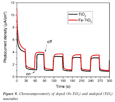 Current densities increased with increasing applied potential. This behavior is widely reported in the literature.4,23,28,29 At the beginning of the scan, the photocurrent of pure TiO2 was higher than that of Fe-TiO2, however, the increase in potential caused an increase in the photocurrent of the doped sample. For example, when the applied potential was 0.7 V, the photocurrent was approximately 4.73 µA cm-2 for Fe-TiO2 and 4.21 µA cm-2 for TiO2. These results indicate that doping promoted a slight increase in photoactivity. Chronoamperometry The chronoamperometry test was performed to evaluate the stability of the samples over time. The results obtained under visible light are presented in Figure 9. It can be seen that both TiO2 and Fe‑TiO2 were stable during the 300 s of the test. The results also show that the doped samples presented a slightly higher photocurrent than the undoped ones. This occurs because iron doping improves light absorption, favoring the separation and migration of charge carriers.4 Furthermore, the current density increased rapidly when the light was turned on and dropped abruptly when the light was turned off, indicating that the samples have a fast response to electron-hole pairs (e--h+) excitation and discharge.