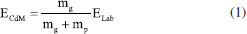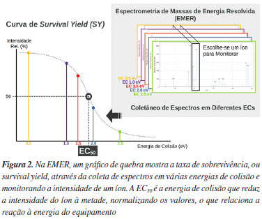 Levando-se em conta que mais de uma colisão pode acontecer, espera-se que a cada colisão uma quantidade discreta de energia cinética seja perdida. Além disso, nem toda energia cinética é convertida em energia interna quando o íon precursor colide com o gás neutro. Na verdade, alguns fatores como a inelasticidade (η) da colisão e mesmo a massa do gás neutro influenciam a colisão, e.g., hélio ou nitrogênio.2 A ECdM é amplamente utilizada em espectrometria de massas de energia resolvida (EMER) para obter-se curvas de rendimento de sobrevivência (do inglês, survival yield, SY), que em um primeiro momento servem para visualizar o comportamento das intensidades dos íons em função da energia de colisão (EC) de forma qualitativa, ou pseudo-quantitativa, como quando compara-se qual o valor de EC para reduzir 50% da intensidade de diferentes estruturas moleculares de íons precursores, chamado também de EC50. Por isso, em alguns trabalhos, utiliza-se intercambiavelmente ECdM e EC50, ainda que conceitualmente ambas não sejam exatamente a mesma.27 Especificamente, o SY é a forma mais adequada de estudar a relação da energia de colisão com as reações de dissociação que ocorrem em experimentos do tipo CID, sem necessitar modificar a estrutura física do equipamento. A Equação 2 define o SY em função das intensidades. Estas, por sua vez, dependem diretamente da energia de colisão, como realçado. Ip+(E) é a intensidade do íon precursor e If+(E) a intensidade do íon fragmento.