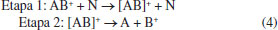 Quando o íon precursor colide com o gás, dois processos ocorrem, conforme sumarizado na Equação 4, em que AB+ é o íon precursor, N o gás de colisão, A a perda neutra, B+ o íon fragmento e [AB+] o complexo ativado. O primeiro e mais rápido de todos é a colisão direta (etapa 1), em que parte da energia cinética é transformada em energia interna, promovendo uma excitação do precursor, i.e., [AB+] e tem uma constante k1(E) associada. Essa etapa ocorre num regime de tempo de 10-14 a 10-16 segundos.2 A etapa 2 é a dissociação unimolecular do íon precursor ativado e o rendimento dessa reação de dissociação depende da natureza probabilística de dissociação do íon ativado, também tendo uma constante de reação k2(E) associada. O mecanismo desse processo de dois estágios está diretamente relacionado com as duas constantes de reação para cada etapa.1,2