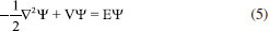 MÉTODOS DE QUÍMICA QUÂNTICA APLICADOS A CID Cálculos ab initio e DFT em química reacional A Equação 5 é a equação de Schrödinger independente do tempo apresentada com seu hamiltoniano cinético e potencial em unidades atômicas, em que ψ é a função de onda dada em qualquer sistema de coordenadas necessários,
