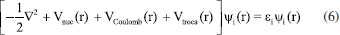 Para além dos sistemas monoeletrônicos, a equação de HF (Equação 6) é utilizada. Neste caso, ψi(r) é geralmente representada com um conjunto de bases combinadas linearmente, como por exemplo, funções gaussianas. Os termos Vnuc(r), VCoulomb(r) e Vtroca(r) são os potenciais de atração elétron-núcleo, repulsão elétron-elétron e de troca eletrônica, respectivamente.