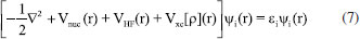 Seguindo a mesma base teórica da Equação 6, a Equação 7 é conhecida como Equação de Kohn-Sham (KS). Nela, além do potencial que advém da equação de HF, VHF(r), um potencial dependente da densidade é adicionado, chamado de funcional de densidade, Vxc[ρ] (r). Esta é a equação base dos métodos de DFT, sendo que existem vários tipos de funcionais disponíveis.