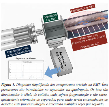 ESPECTROMETRIA DE MASSAS TANDEM DE DISSOCIAÇÃO INDUZIDA POR COLISÃO O design de um equipamento de ionização soft tem como objetivo que, na interface/fonte, as moléculas sejam apenas ionizadas, permitindo, em seguida, sua aceleração e separação em um campo eletromagnético, de modo a determinar diferentes picos de razão massa-carga, denominados picos do íon precursor. Diferentemente da ionização por impacto de elétrons, não se espera que ocorra fragmentação do íon precursor na interface de ionização.1 A Figura 1 apresenta, de forma esquemática, o funcionamento geral de um equipamento de EMT.